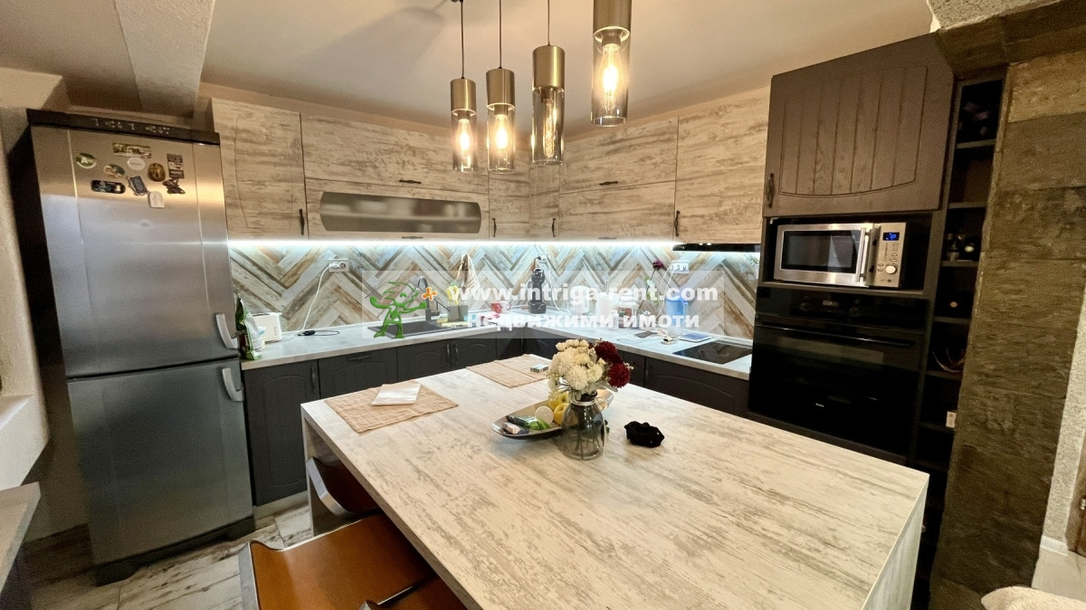 - всекидневна стая / хол : 2 броя дивани, холна маса, секционен модул с голям телевизор, климатик, голяма модерна кухня с остров за хранене, шкаф, хладилник с фризерна част, микровълнова фурна, абсорбатор, кафе машина, втори кухненски шкаф - модулен, съдомиялна машина