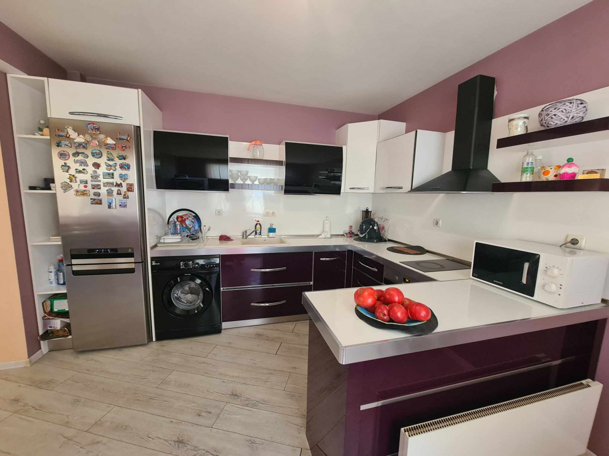 Апартаментът е изпълнен с внимание към детайла и интериор в топли, уютни тонове. Кухненският бокс е оборудван с вградена фурна, стъклокерамичен плот, абсорбер, хладилник и пералня. Отоплението е решено с климатици, а петкамерната дограма с троен стъклопакет осигурява отлична топло- и шумоизолация. Подовите настилки са ламинат, съчетаващ практичност и модерен вид.