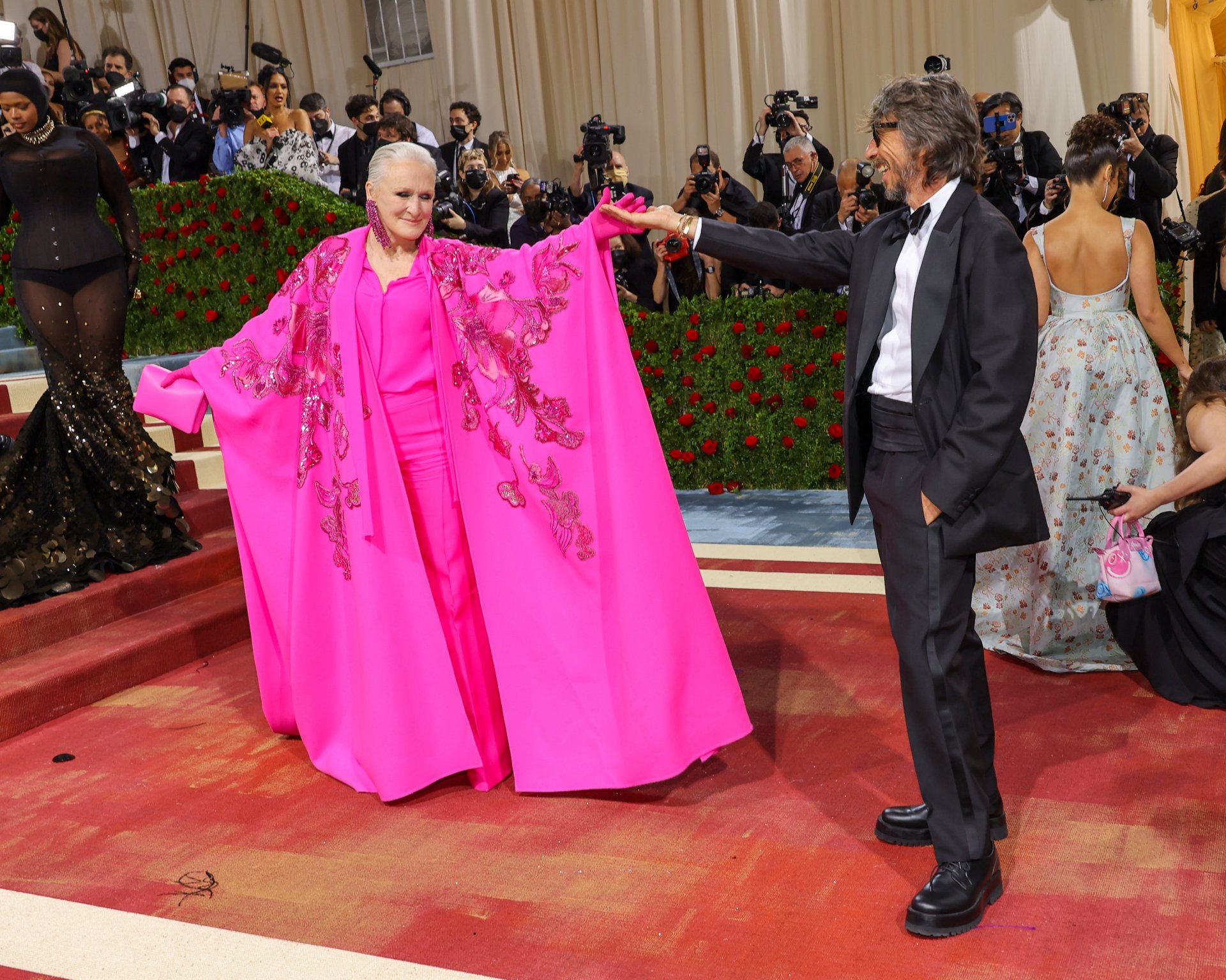 Една от най-елегантните двойки бяха Илон Мъск и майка му Мей. Той с безупречно черен фрак, а тя с рокля с тъмно червен цвят, падаща свободно като кафтан и с дълго перлено колие.