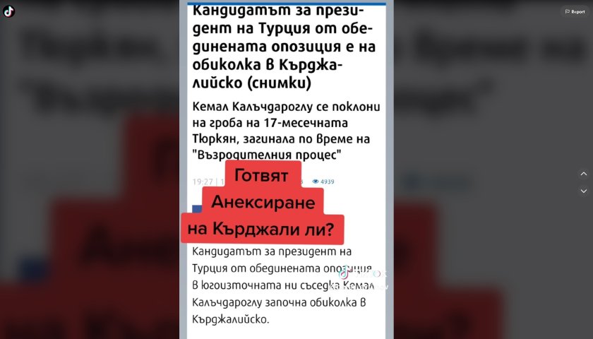 Публикации в профилите на потребител на TikTok и Facebook отправят внушения за териториални претенции към България от страна на кандидата за президент на турската обединена опозиция Кемал Кълъчдароглу. Поводът е негова визита в Кърджалийско, в рамките на която той посети емблематични за турското малцинство у нас места.