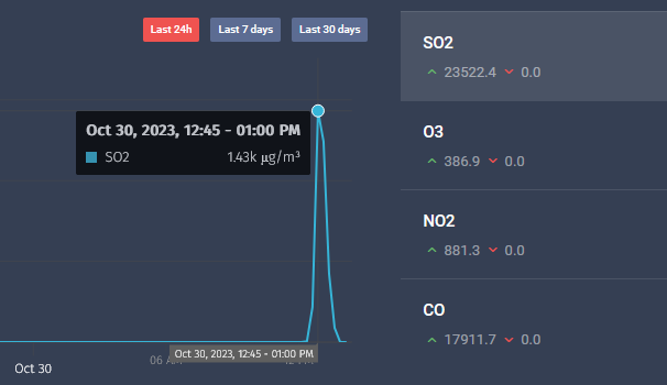 Стойностите на серен диоксид в Димитровград започват да се повишават, към 12 часа днес, АИС Раковски - Димитровград е отчела нива от 172 µg/m3, което е далеч под средночасовата норма от 350 µg/m3, но в последния час, независимите станции отчитат краткотрайни завишения до нива от близо 1500 µg/m3.