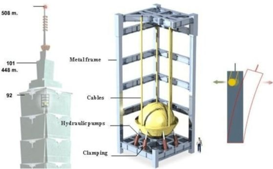 Motioneering проектират 660-тонно стоманено махало, което служи за инерционен демпфер (гасител) на колебанията и струва 4 милиона долара.
