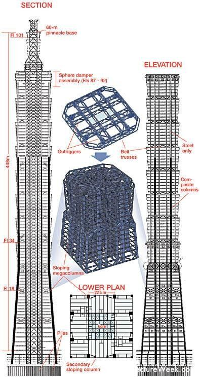 Конструкцията е изпълнена от стоманени рамки с комбинирани стомано-стоманобетонни греди и комбинирана стомано-стоманобетонна подова конструкция. За поемането на вертикалните товари са използвани осем комбинирани стомано-стоманобетонни мегаколони със запълнено с високоякостен бетон съставено квадратно стоманено сечение. Допълнителните ферми, разположени на интервали от осем етажа, свързват колоните в ядрото на сградата към тези отвън.