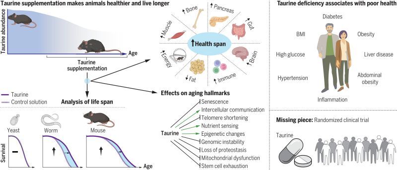 Може ли да бъде „еликсирът на живота и дълголетието“, както предполага д-р Виджай Ядав (Vijay Yadav), генетик от Колумбийския университет, който е водещ изследовател в проучване, публикувано в престижното списание Science с привлекателното заглавие „Дефицитът на таурин като двигател на стареенето“ (Taurine Deficiency As a Driver of Aging)? Проучването включва повече от 50 учени от цял свят и описва хранене с таурин на мишки, маймуни и червеи, за да се изследва ефектът на съединението върху стареенето. Продължителността на живота на третираните мишки се е увеличила с 10 до 12 процента в сравнение с контролна група, която не е получавала добавки, а третираните червеи също са живели по-дълго.