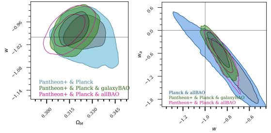 Последните ограничения от анализа на Pantheon+, най-големия набор от данни от този вид, включващ 1550 свръхнови тип Ia, са напълно в съответствие с това, че тъмната енергия не е нищо повече от „ванилова“ космологична константа. „Тази космологична константа е като ванилов сладолед, много е добра, но някак скучна“, заключава Питър Гарнавич, космолог от университета Нотр Дам. „Премахването ѝ ще накара да се срути цялата конструкция, освен ако няма по-добра теория, която да я замени." От тази публикация от 2022 г. няма доказателства в полза на нейната еволюция нито във времето, нито в пространството, но всяко отклонение от w = -1 и w_a или w', би променило напълно предполагаемата съдба на нашата Вселена: нещо, което според данните на BAO се предлага. Кредит : D. Brout et al./Pantheon+, ApJ , 2022 г