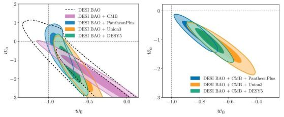 Ако тъмната енергия не е константа във времетоАко тъмната енергия не е константа във времето, тогава тя не трябва да се описва с един параметър, w, а по-скоро с два или повече параметъра, които позволяват еволюция с времето. На тази фигура пресечната точка на пунктираните линии съответства на проста космологична константа за тъмна енергия; данните от DESI, когато се комбинират с CMB и/или данни от свръхнови, силно подкрепят развиваща се форма на тъмната енергия, която отслабва с времето. Кредит: сътрудничество с DESI, arXiv:2404.03002, 2024 г.