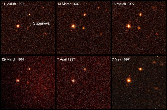 Първо, работата на учени, изучаващи далечни свръхнови, води до революционен набор от измервания: измервания, които очертават връзката между червеното отместване и разстояние на стандартни обекти - тип Ia свръхнови - чиято присъща яркост може да е определи само от измерване на светлината от същите свръхнови.