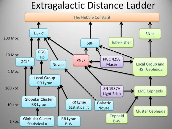 Изграждане на извънгалактична скала: чрез свръхнови тип Ia, чрез гравитационни лещи, чрез червени гиганти, чрез галактики с активни ядра, чрез мазери и др. Кредит: Wikimedia Commons