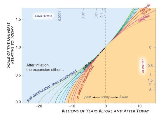 Измерването назад във времето и разстоянието (вляво от „днес“) може да ни информира как Вселената ще се развива и ускорява или забавя далеч в бъдещето. Ако се свърже скоростта на разширяване със съдържанието на материя и енергия във Вселената и се измери скоростта на разширение, може да се направи оценка за времето, изминало от началото на горещия Голям взрив. Данните за свръхновите в края на 90-те години са първият набор от данни, който показва, че живеем в богата на тъмна енергия Вселена, а не в доминирана от материя и радиация. Кредит: Saul Perlmutter/UC Berkeley