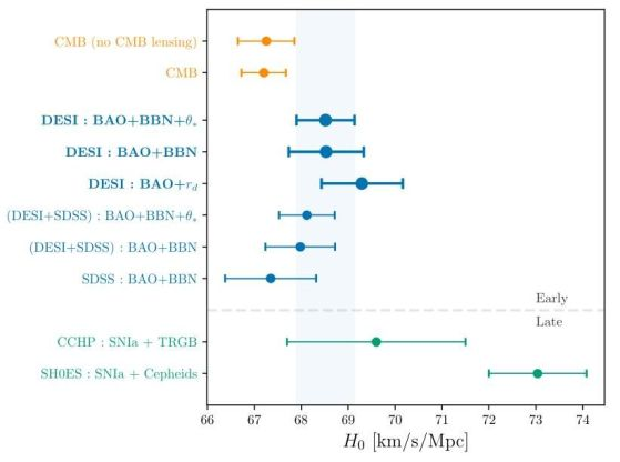 Голям клас ранни реликтови методи, включващи CMB и/или BAO (със специфичен фокус върху публикациите на DESI), всички те описват Вселената, разширяваща се с ~67 km/s/Mpc. Въпреки че има няколко групи, които имат отличаващи се стойности за измервания по Скалата за разстоянията (включително CCHP групата, показана като предпоследна долу), най-силните измервания, от сътрудничеството на SH0ES и Pantheon+ например, предпочитат стойност от ~ 73 km/s/Mpc. Двата набора от стойности не съвпадат при повече от 5-сигма значимост. Кредит: сътрудничество с DESI, arXiv:2404.03002, 2024 г.