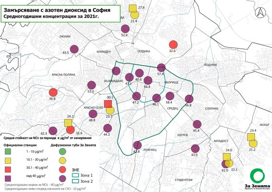 Резултати от измервания на „За Земята“ с данни за 2021 г. за замърсяването с азотен диоксид в града. Проблемът не е взет предвид в планирането на двата кръга на зоната с ниски емисии от транспорта в София, отбелязани на графиката