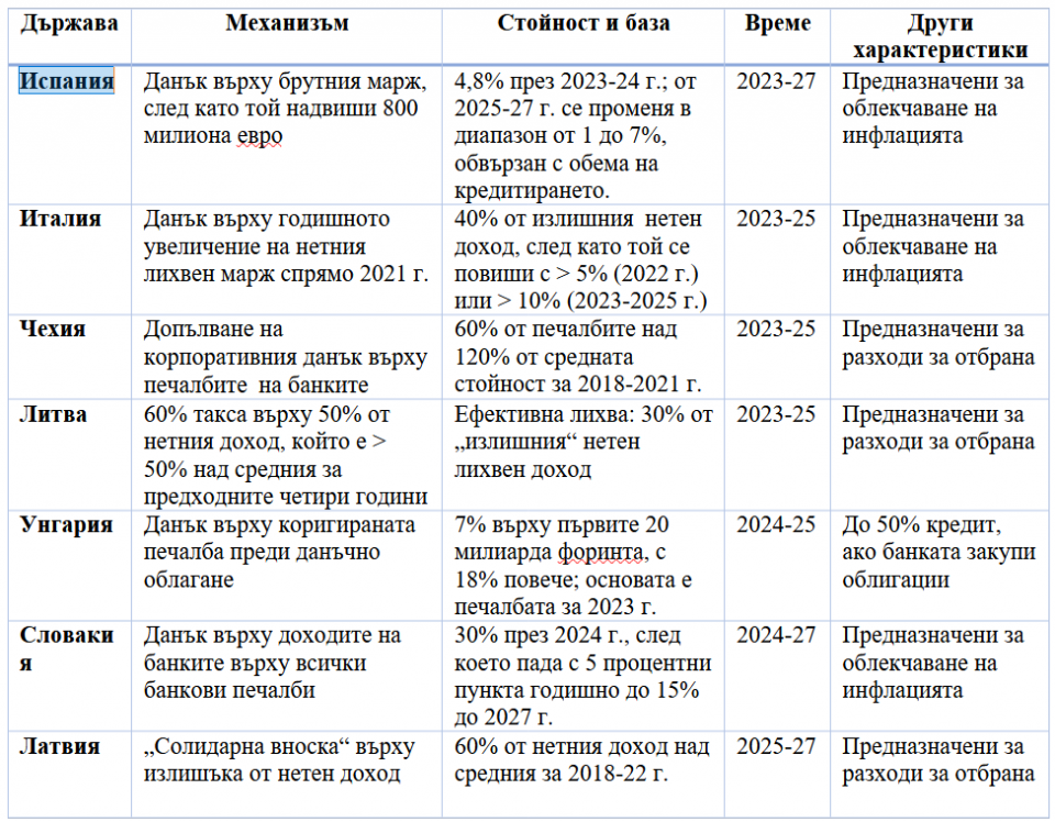 С цел облекчаване на инфлацията Италия, Унгария, Словакия, Испания въведоха през 2023 г. данъци върху свръхпечалбата и неочакваните приходи на банките. Чехия, Латвия и Литва въведоха допълнително облагане на банковия сектор с цел финансиране на разходи за отбрана.
