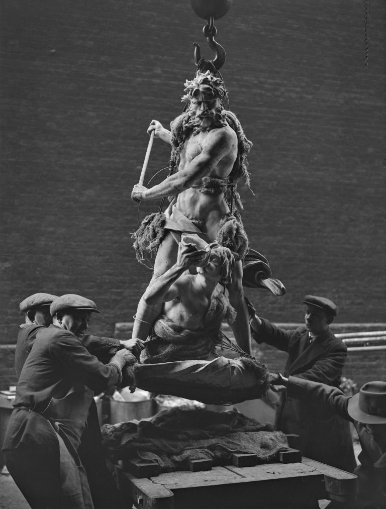 Работници разтоварват статуята „Нептун и Главк“ от Бернини пред Кралската академия на изкуствата на Пикадили, Лондон, за изложба на изкуството от 17-ти век. Снимка: Getty Images