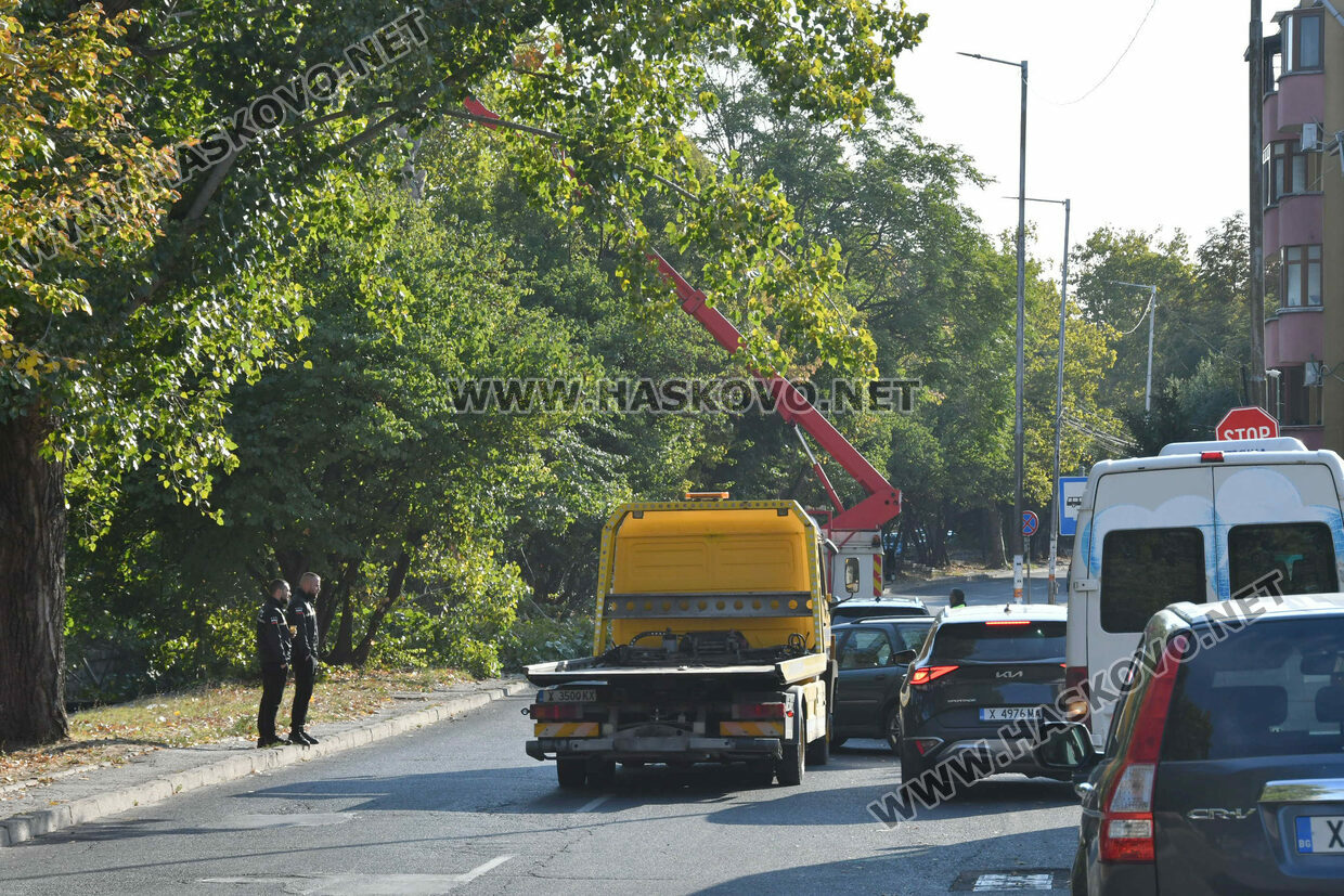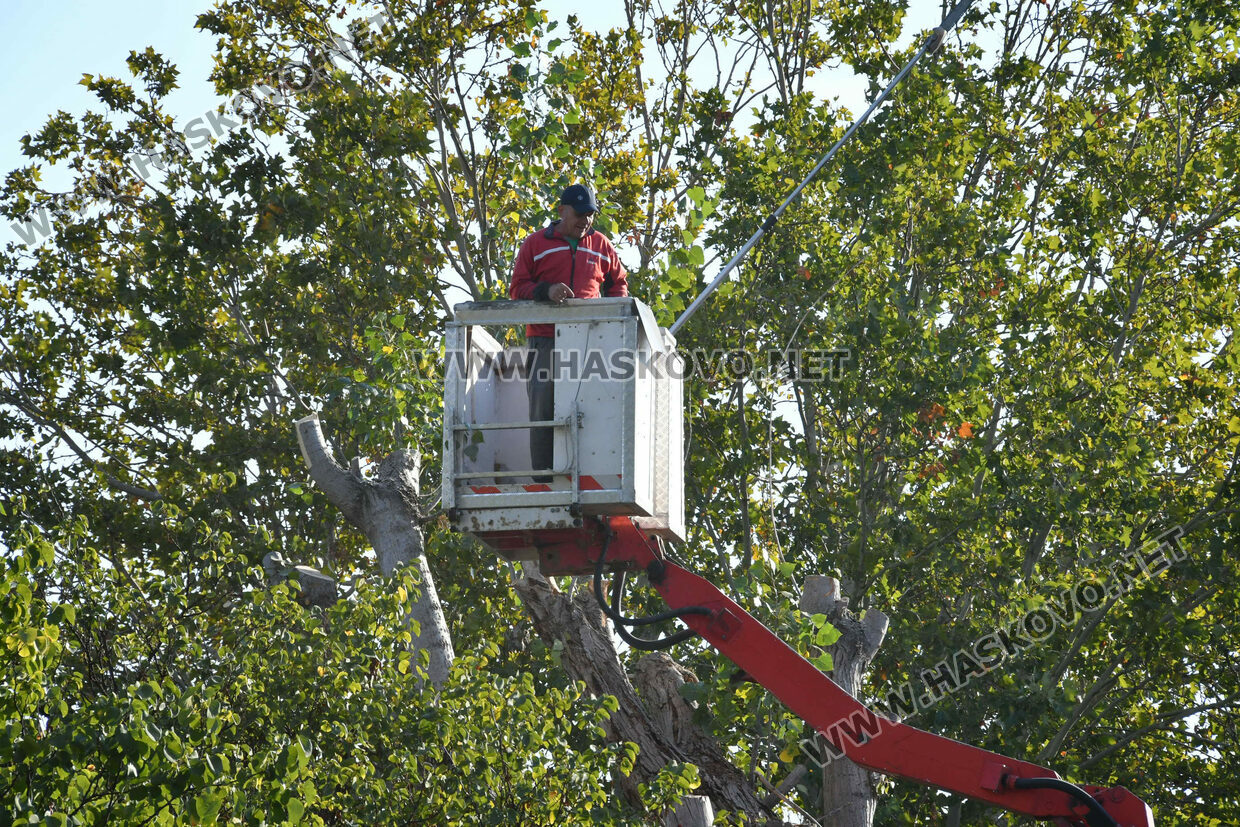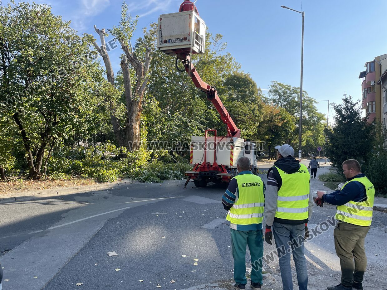 Затвориха булевард „Илинден“ в Хасково заради резитба на стари тополи. Пътното платно е отцепено от екипи на „Общинска полиция“, а служители на „Екопрогрес“ извършват резитбата на дърветата с помощта на специализиран автомобил тип „вишка“. Има и служители на общинската служба КОРЗ.