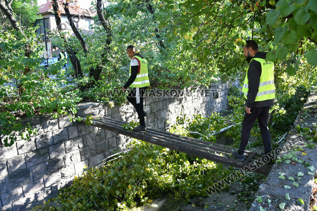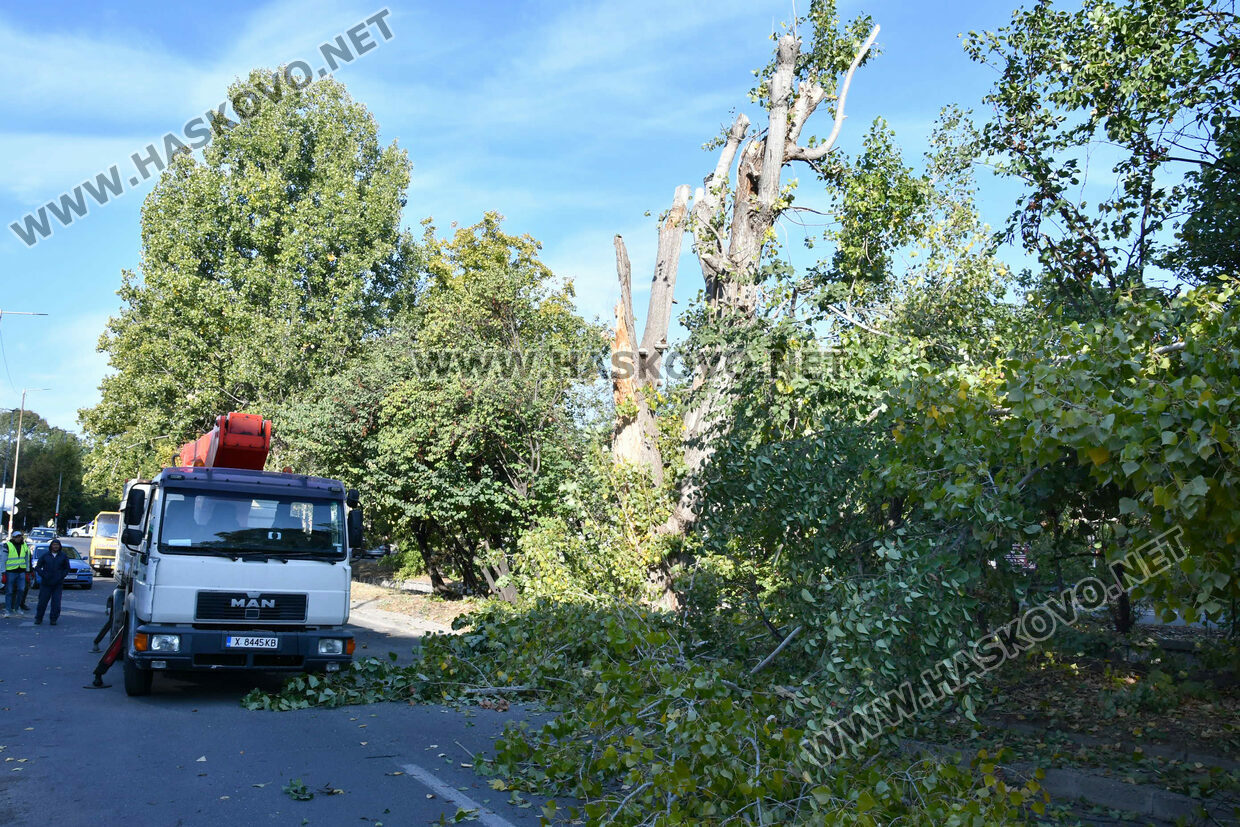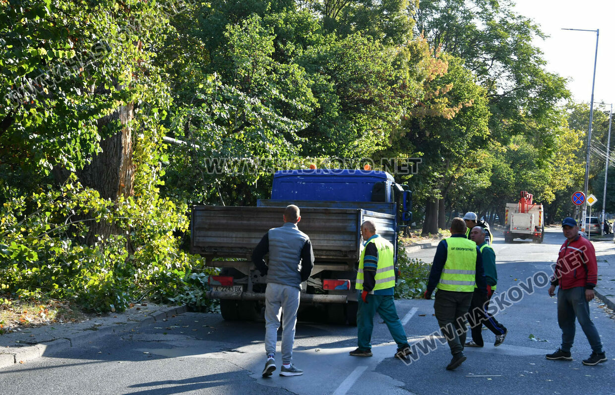 Затвориха булевард „Илинден“ в Хасково заради резитба на стари тополи. Пътното платно е отцепено от екипи на „Общинска полиция“, а служители на „Екопрогрес“ извършват резитбата на дърветата с помощта на специализиран автомобил тип „вишка“. Има и служители на общинската служба КОРЗ.