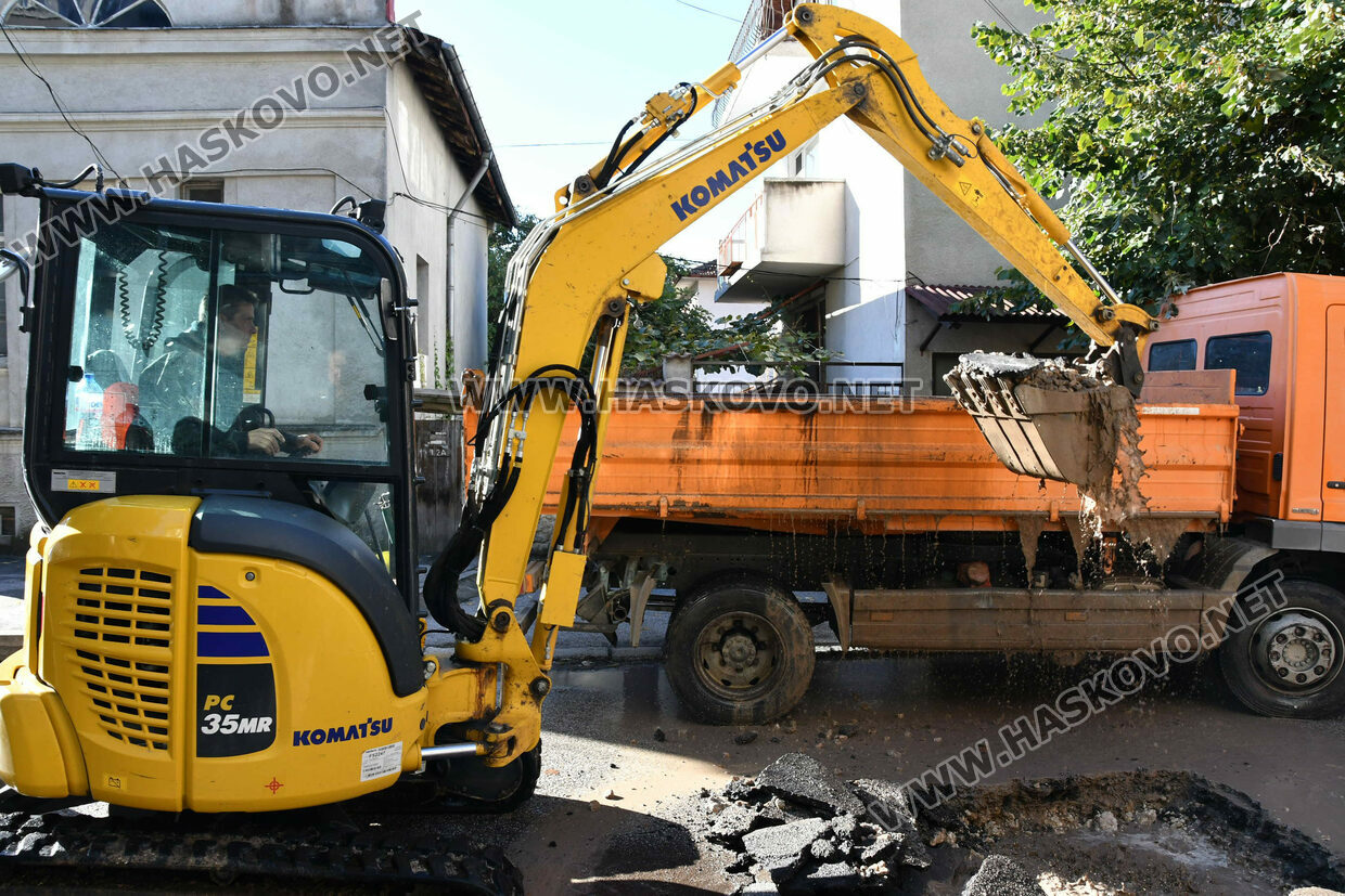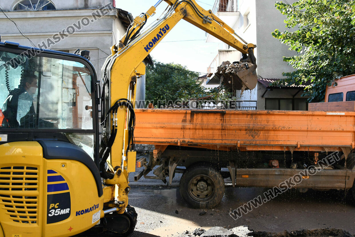 Работници на ВиК отстраняват авария по тръбопровод за питейна вода на ул. „Екзарх Антим Първи“ в Хасково, пред сградата на Жандармерията, видя екип на Haskovo.net.
