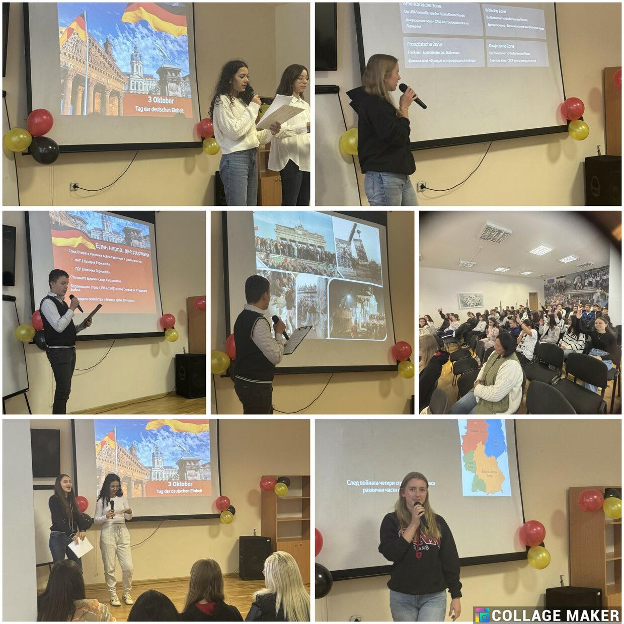 Празникът бе отбелязан с поредица от занимания подготвени в часовете по немски език,чрез които учениците не само научиха повече за важността на тази историческа дата,но и имаха възможност да се потопят в културата и традициите на Германия, коятоеизключително богата в културно и историческо отношение страна. Тя предлага разнообразие от обичаи и прелестни пейзажи – от гористи хълмове до заснежени планини и речни долини. Всяка част от тази централноевропейска държава излъчва своя собствена уникалност: спокойствието на Мюнхен, романската архитектура на Кьолн, впечатляващият Берлин, футуристичният силует на Франкфурт, величественият Дрезден – списъкът е безкрайно дълъг.