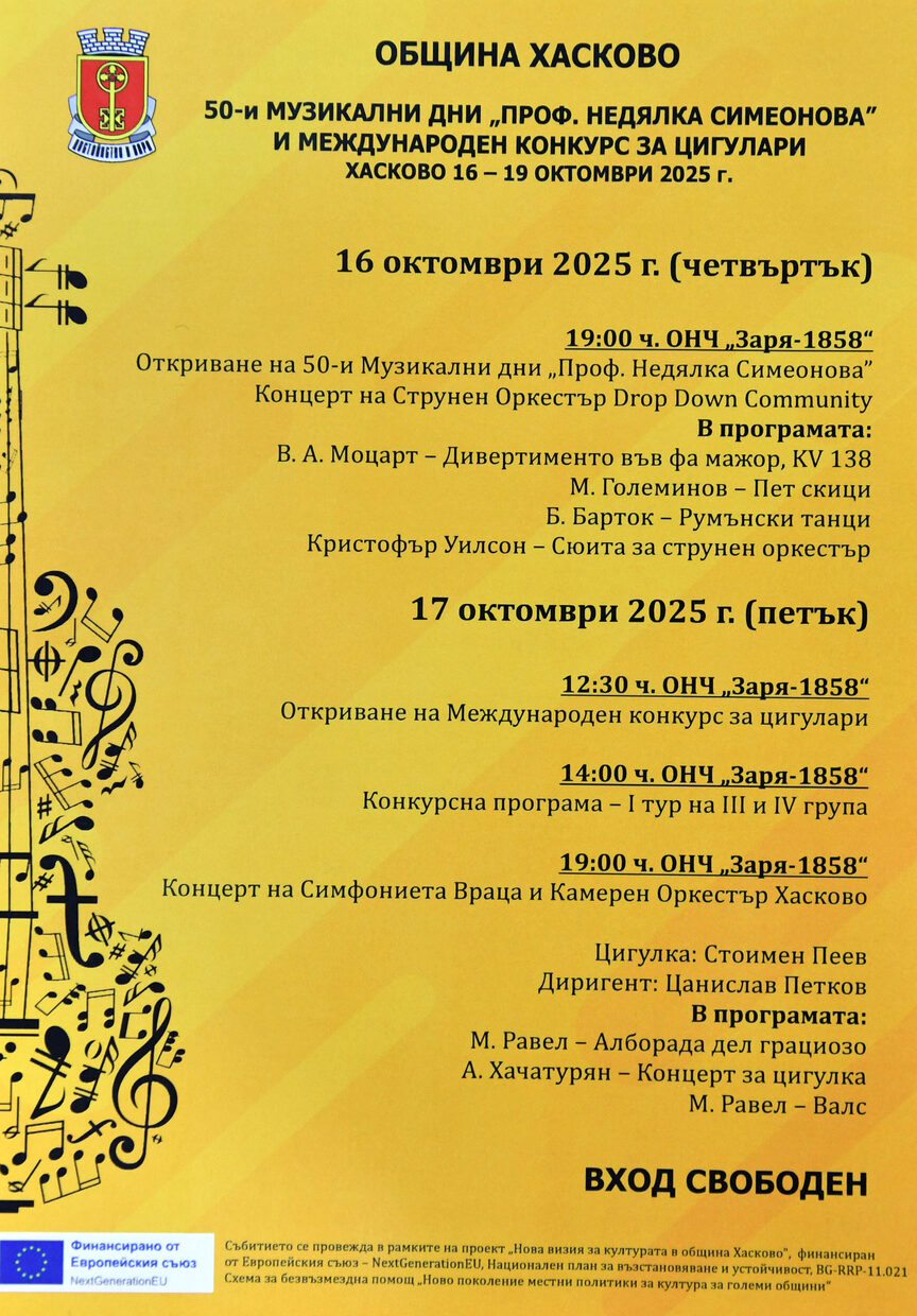 Юбилейното издание на празника на класическата музика в Хасково тази година предлага четиридневна програма, благодарение на проекта „Нова визия за културата в община Хасково“, финансиран от Европейския съюз – NextGenerationEU, НПВУ, Схема за безвъзмездна помощ „Ново поколение местни политики за култура за големи общини“. Именно чрез проект хасковските ценители на изкуството за първи път ще могат да се насладят на изпълненията на Струнен оркестър Drop Down Community.