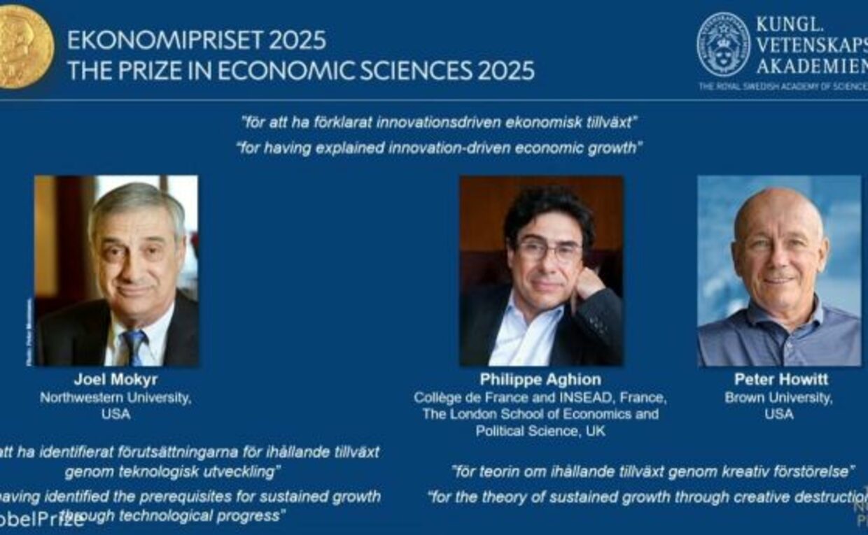 Наградата на Шведската риксбанка за икономически науки в памет на Алфред Нобел за 2025 г. е присъдена на Джоел Мокир (Joel Mokyr), Филип Агион (Philippe Aghion) и Петер Хауит (Peter Howitt) "за обяснение на икономическия растеж, обусловен от иновациите", като едната половина ще бъде присъдена на Мокир "за идентифициране на предпоставките за устойчив растеж чрез технологичен прогрес“, а другата половина получават съвместно Агион и Хауит "за теорията за устойчив растеж чрез съзидателно разрушение".