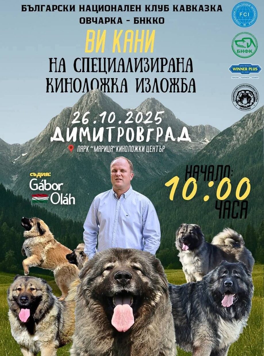 На 26 октомври 2025г. от 10.00 часа в Киноложки център "Марица" ще се проведе специализирана киноложка изложба на Кавказка овчарка. Събитието се организира от "Национален клуб Кавказка овчарка – България“. Очаква се да вземат участие над 70 кучета от цялата страна – представители на клуба, развъдчици и любители на породата, както и гости от други киноложки среди. Домакин на проявата е модерната база на киноложки център „Марица“ – едно прекрасно място, което ще събере развъдчици, собственици и любители на тези впечатляващи кучета. Очакванията са изложбата да се превърне в истински празник за всички почитатели на кавказката овчарка.