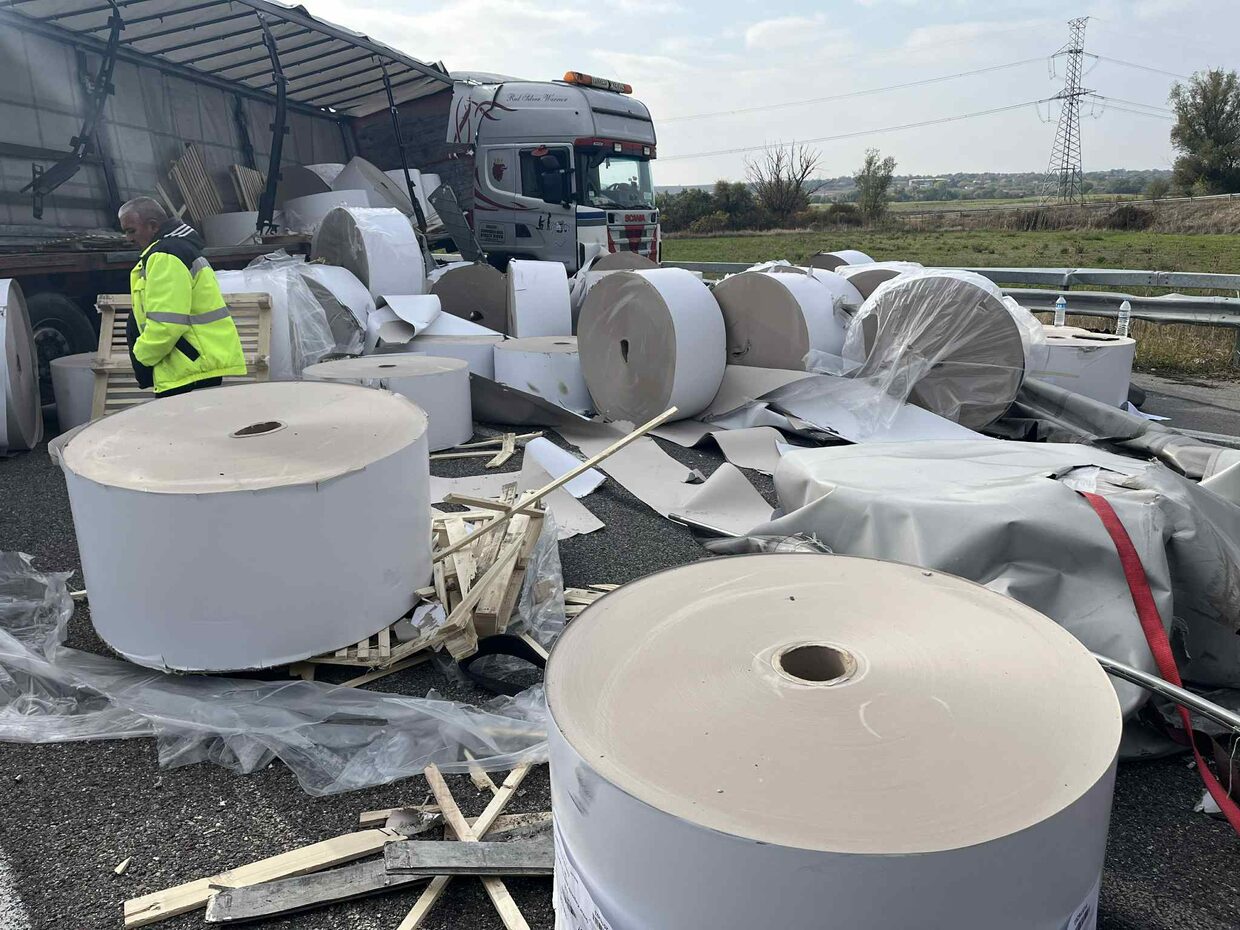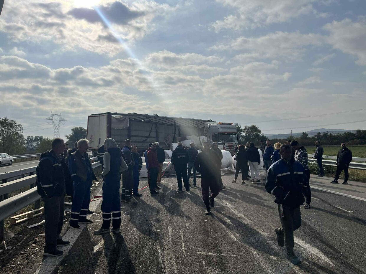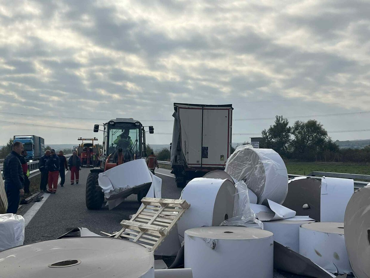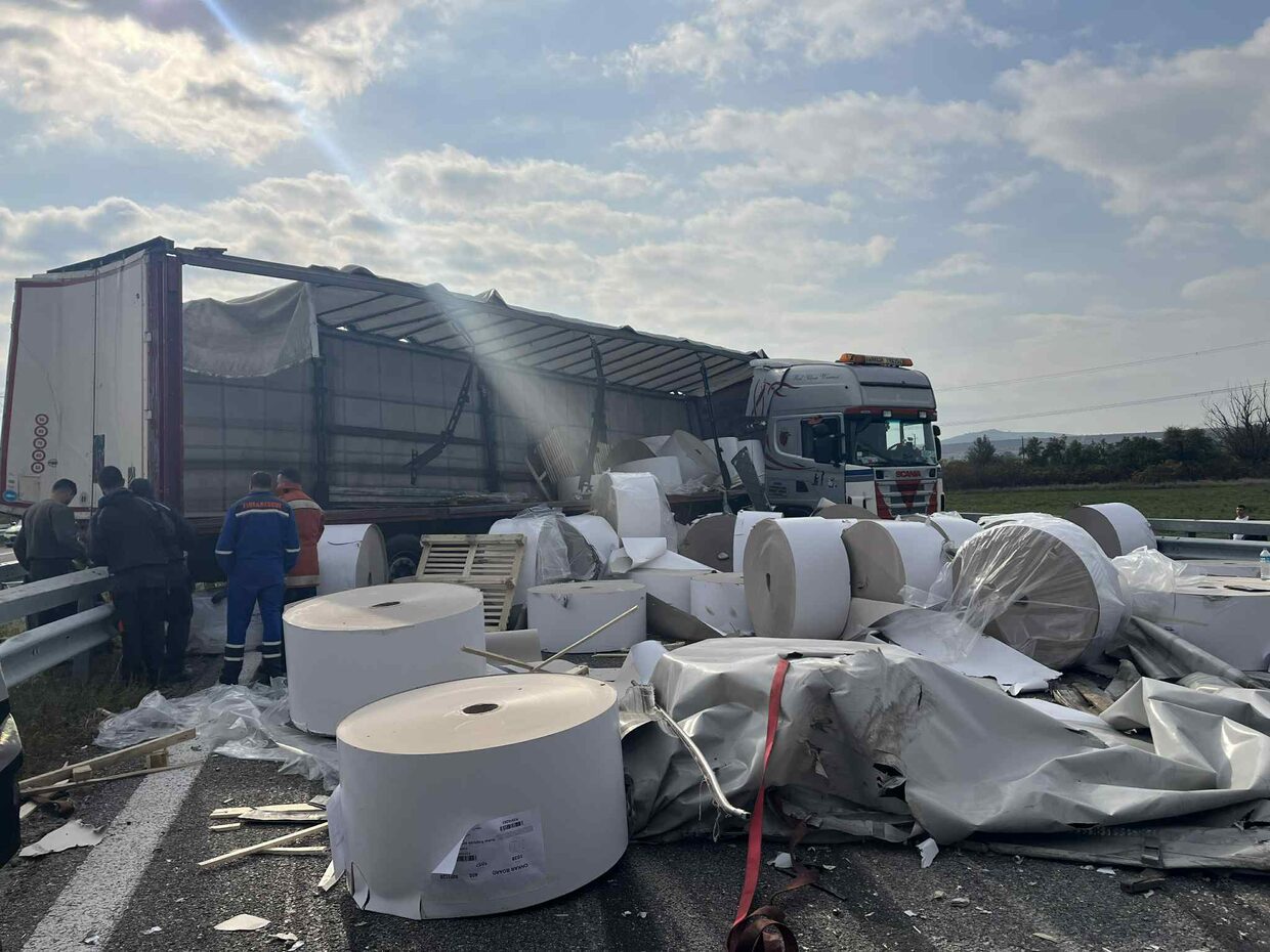 Камионът е превозвал топове хартия. При катастрофата превозното средство се бе забило в мантинелата, а стоката се бе разпиляла по пътното платно.