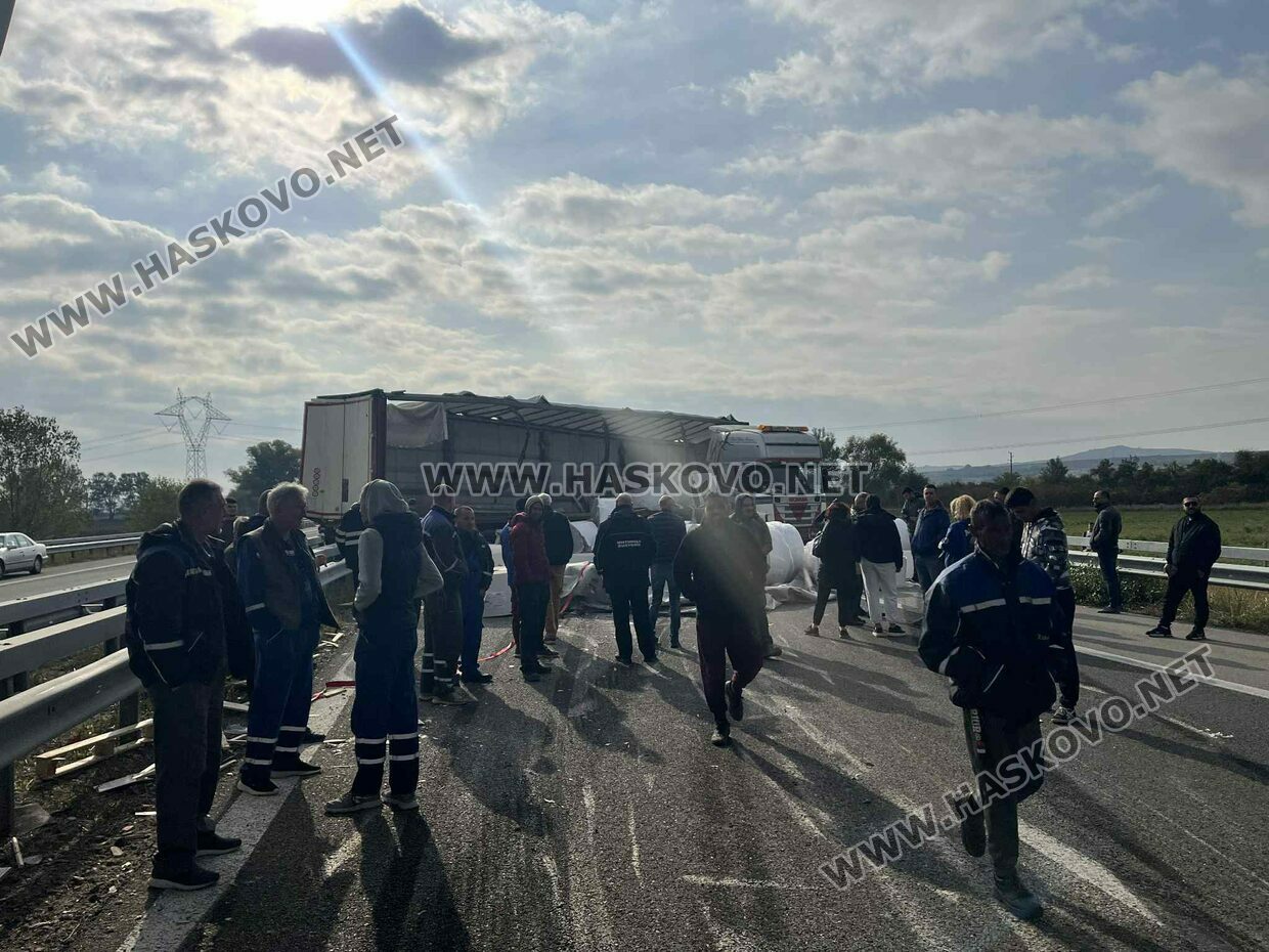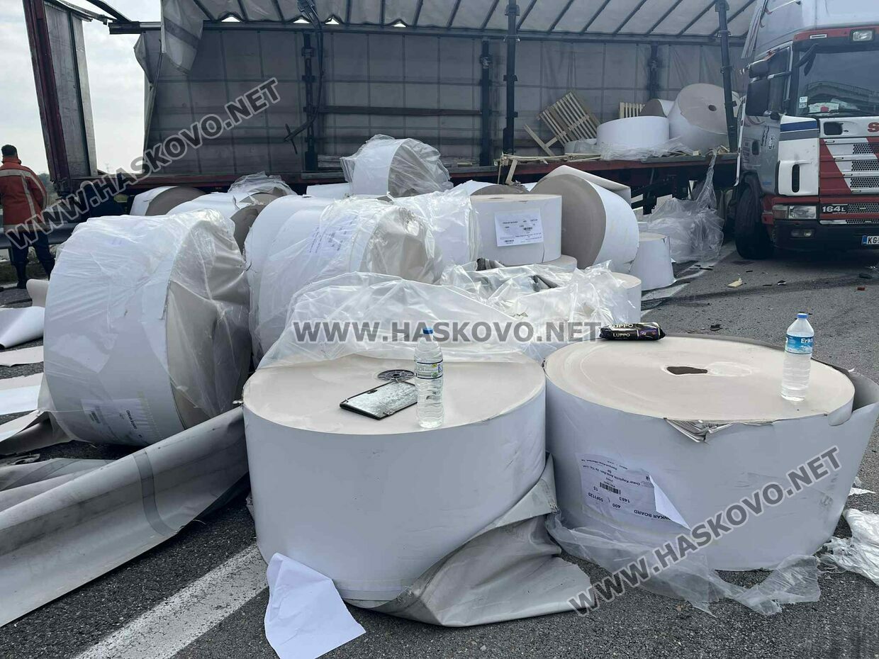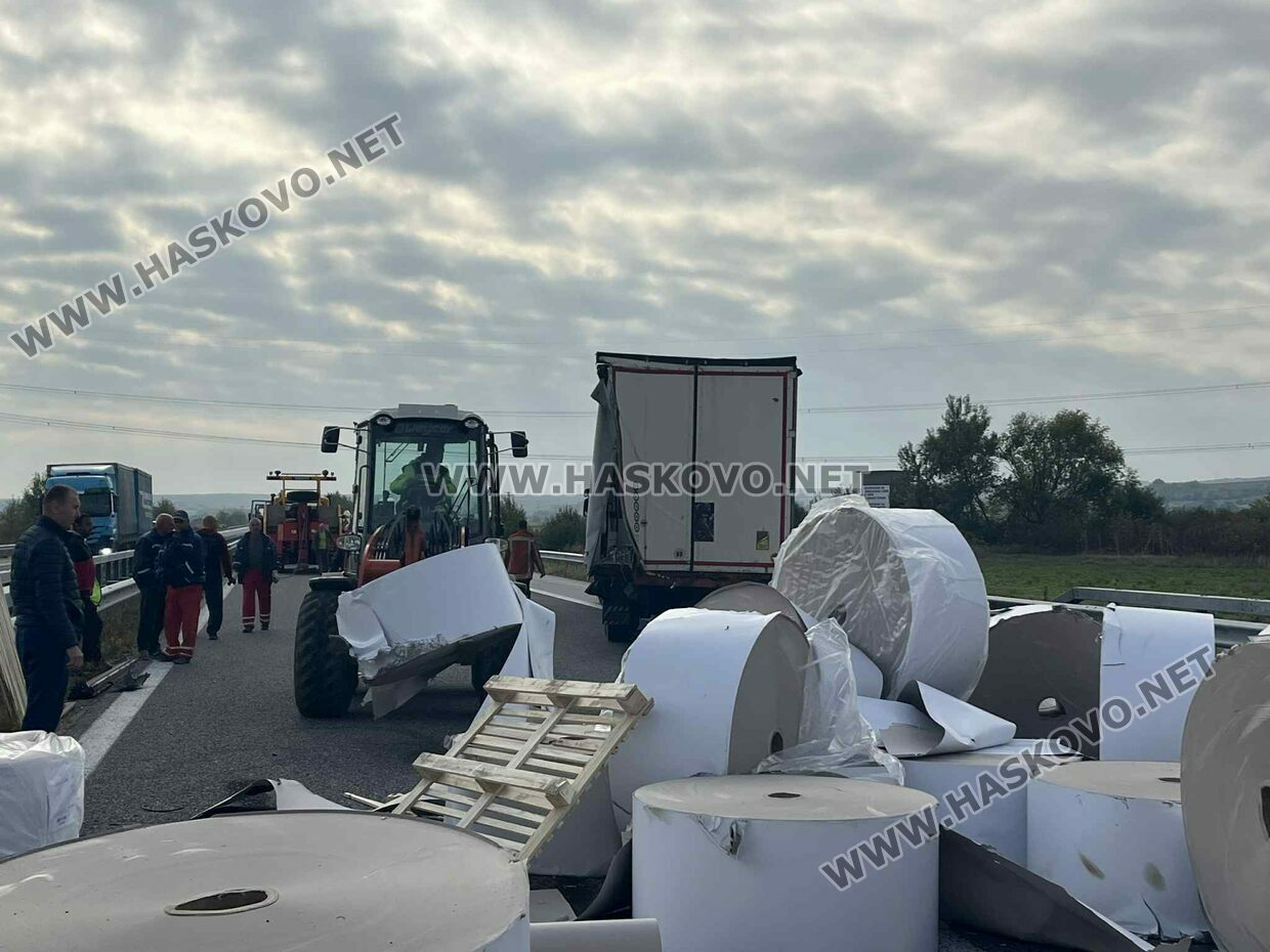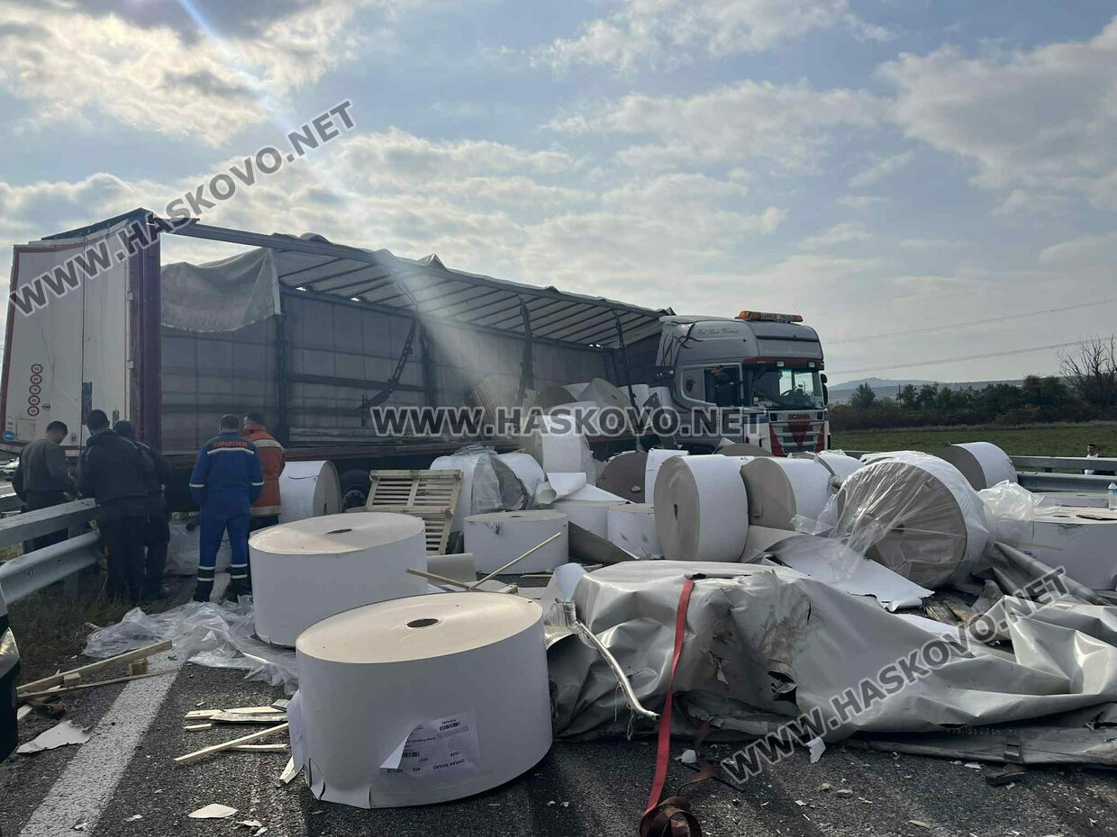 Тир, натоварен с тоалетна хартия, катастрофира и затвори автомагистрала „Марица“ в Хасковска област. Инцидентът стана около 8:20 часа при 23-и километър в платното в посока към Свиленград.