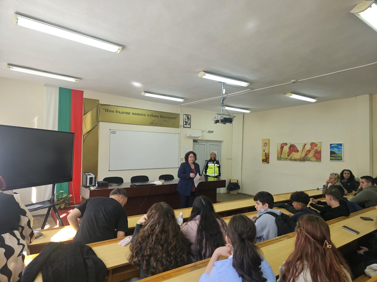 Полицейският инспектор Вили Бонина продължи наболялата напоследък тема за пътните инциденти, като изложи пред ученици данни за страшната статистика в страната ни напоследък за изключително тежките пътно-транспортни престъпления, множество на брой и все по-често с участници млади хора. Тя акцентира, че е изключително важно вниманието и концентрацията на пътя, като им маркира основните причини, които водят до нарушение на концентрацията при управление МПС, след което насочи вниманието им към управлението на такова след употреба на алкохол и наркотични вещества. За да добият по-ясна представа практически за темата, на учениците бяха показани какво представляват т.нар. “Дрегер“ - техническото средство за измерване на алкохол в кръвта, както и „Дръг Тест“-система за установяване на употреба на наркотични вещества. „Не си и помисляйте да употребите алкохол или наркотично вещество и да се качите да шофирате!“, апелира към младежите инспектор Бонина.