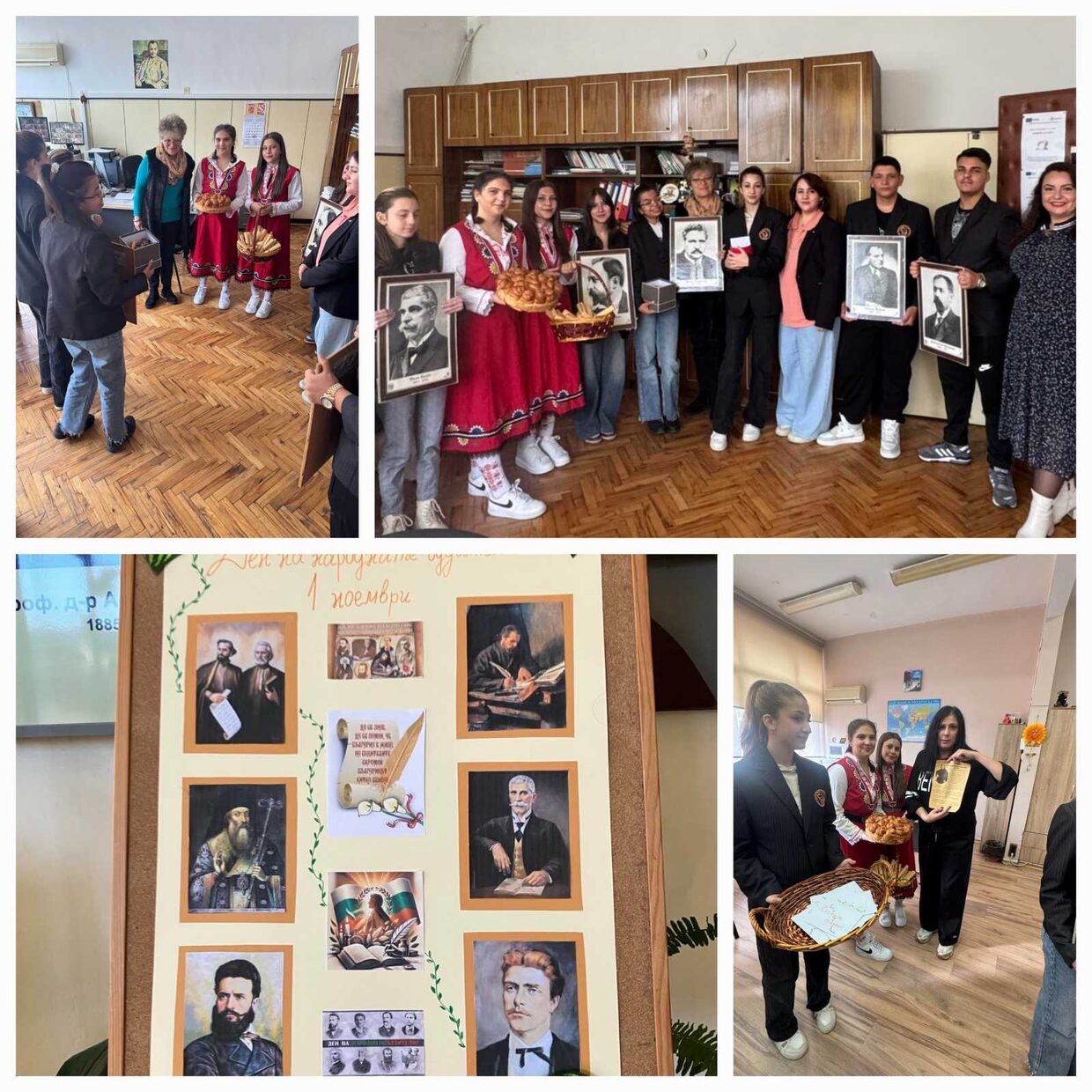 Коридорите на училището се оживиха с пъстри народни носии и усмивки на момичетата ни, които поднасяха пита, по стар български обичай. Подготвените от учениците свитъци с биографични данни за будители, напомниха за труда и вдъхновението на великите българи.