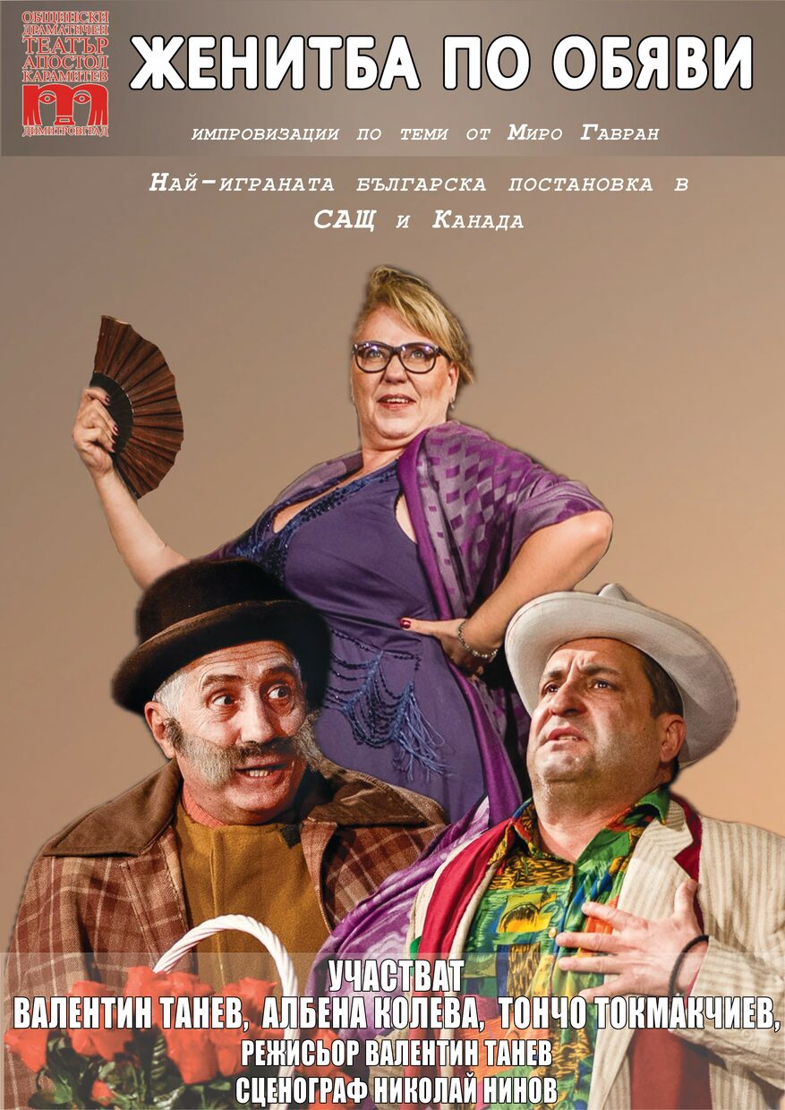 Едни от най-обичаните български актьори, познати от телевизията, киното и театъра – Албена Колева, Тончо Токмакчиев и Валентин Танев играят в спектакъла „Женитба по обяви“ по импровизации на най-популярния хърватски драматург и текстописец Миро Гавран.