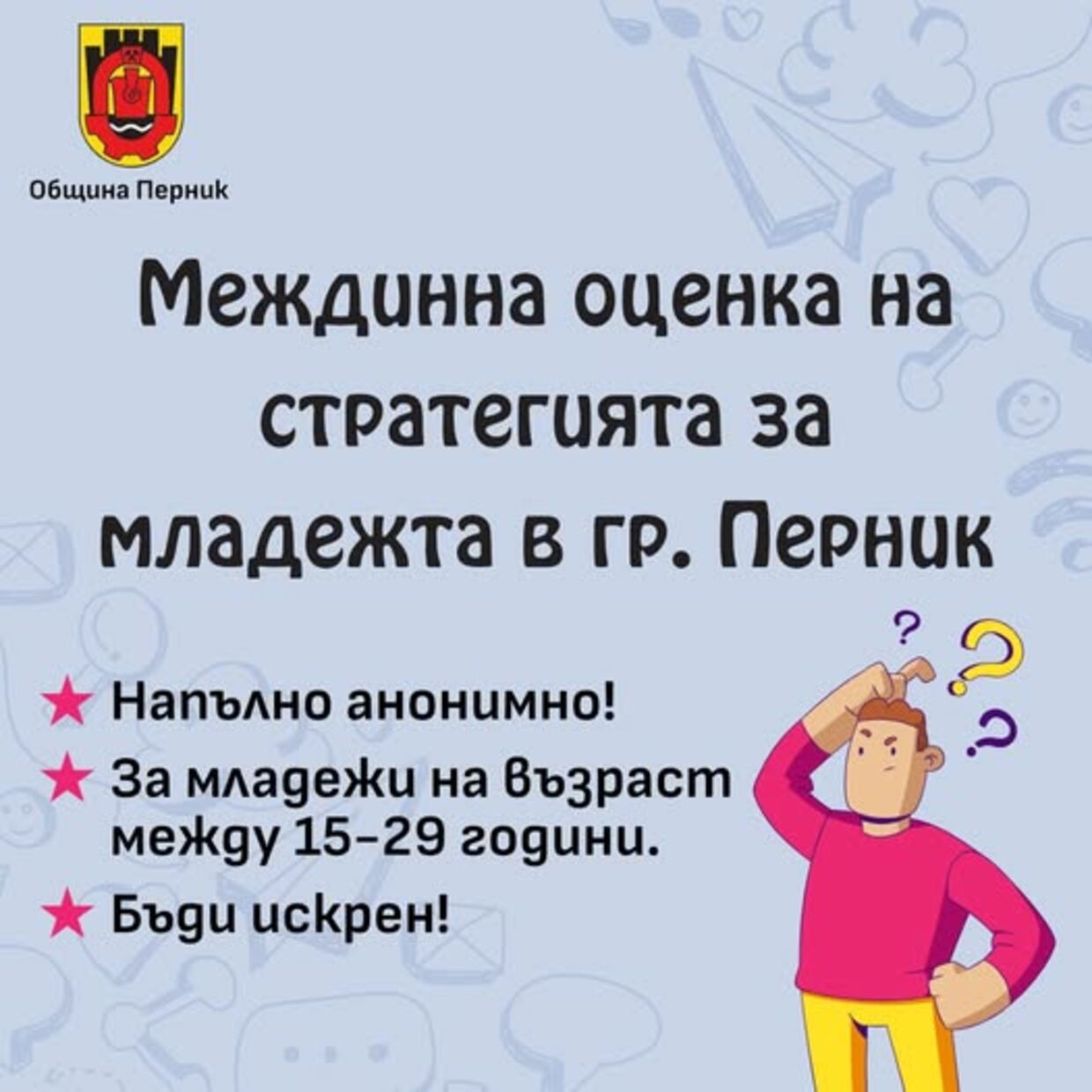 Община Перник провежда междинно изследване сред младите хора в подкрепа на Общинската стратегия за младежта 2022–2030 г Проучването е насочено към всички млади хора на възраст между 15 и 29 години, които живеят или пребивават трайно на територията на нашия град. Целта е да се разберат нуждите, интересите и активностите на младите перничани и да се чуе тяхното мнение за развитието на младежката среда в Перник. Анкетата можете да намерите тук:https://www.smartsurvey.co.uk/s/Pernik2025/