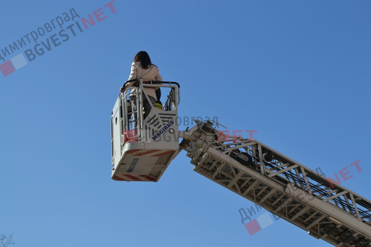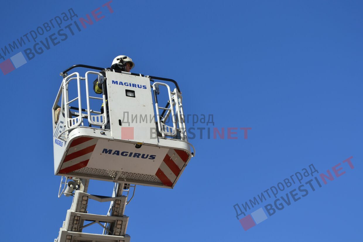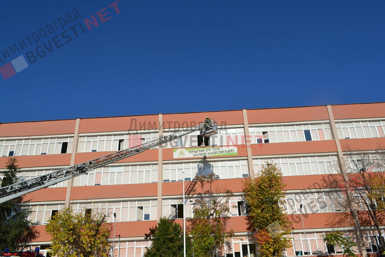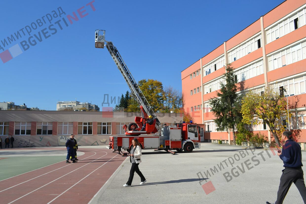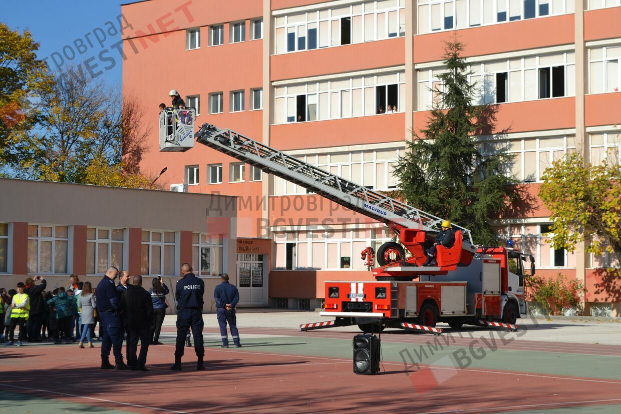 Безспорно най-емоционалната част от учението беше разпъването на 30-метровата пожарникарска стълба, с помощта на която бе евакуирана директорката на училището Мария Янева от прозорец на четвъртия етаж.
