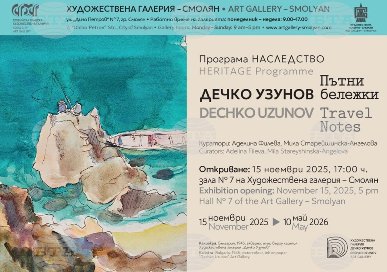 В Художествената галерия в Смолян на 15 ноември от 17:00 часа ще бъде открита изложбата „Дечко Узунов. Пътни бележки“, съобщиха от институцията. Експозицията е посветена на 125-годишнината от рождението на големия български художник и е част от поредицата инициативи на Софийската градска художествена галерия, подготвени за юбилея през 2024 г.
