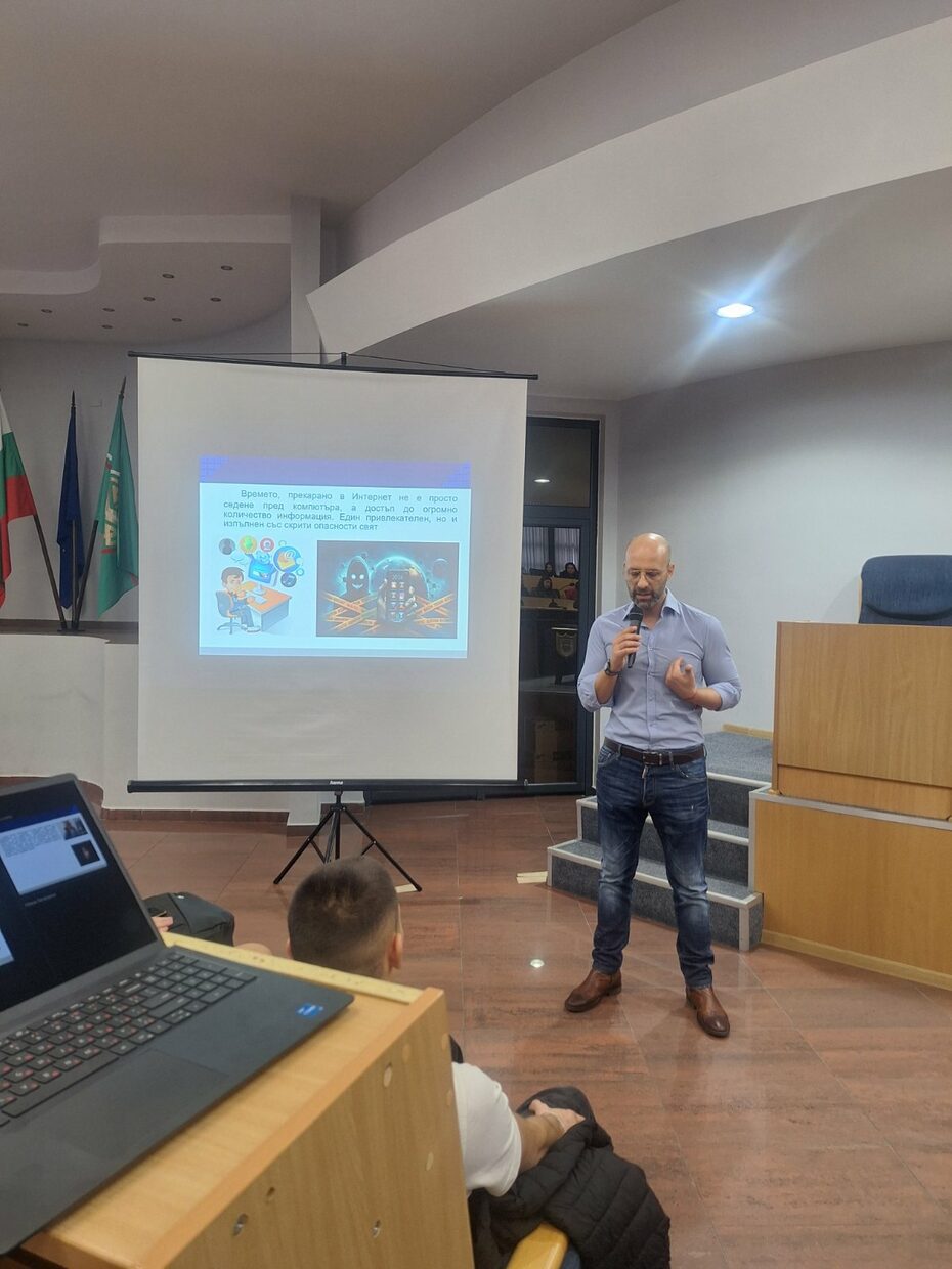 Рисковете в дигитална среда, фалшиви профили, хакерски атаки, откраднати лични данни и как децата са се защититят и да работят безопасно в интернет пространството бяха сред темите, които утвърдения експерт запозна в практико-приложното обучение присъстващите в залата ученици.