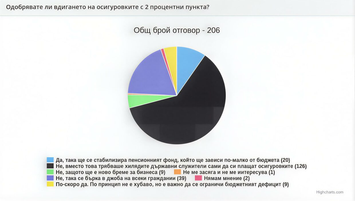 В допитването с въпрос „Одобрявате ли вдигането на осигуровките с 2 процентни пункта?" са участвали 206 души. 126 от отговорилите или 61,2% отговарят, че не одобряват и смятат, че вместо това е трябвало да се задължат хилядите държавни служители да си плащат сами осигуровките. 39 от анкетираните или 18,9% не одобряват, защото смятат, че така ще се бръкне в джоба на всеки гражданин. 9 души или 4,4% не одобряват, защото смятат, че това ще е ново бреме за бизнеса.