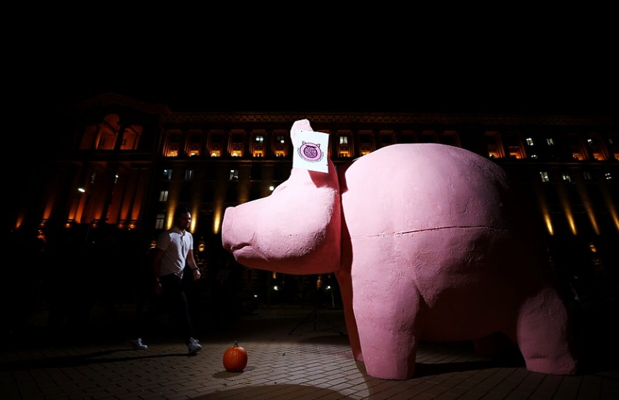 Рано тази сутрин пред парламента се появи фигура на едро розово прасе, което се превърна и в атракция за протестиращите. Прасето - символизиращо проблемния проектобюджет, разлюти сериозно хората на Делян Пеевски в НС и депутати през деня се хвърлиха да пишат със спрей по него спорни надписи.