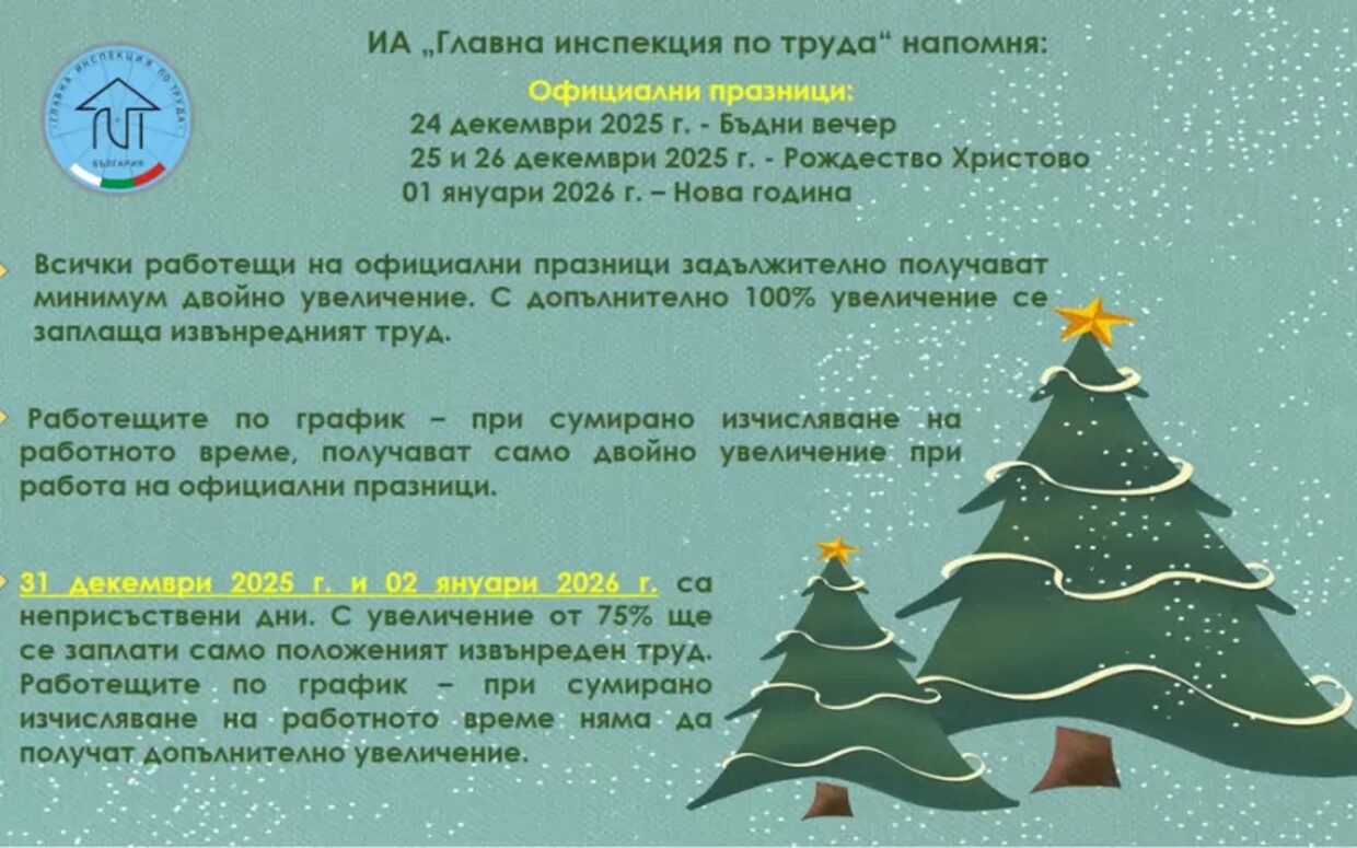 В поредицата от коледни и новогодишни празнични дни официални празници, според Кодекса на труда, са: 24 декември - Бъдни вечер, 25 и 26 декември - Рождество Христово, и 1 януари - Нова година. Положеният труд по време на тези празнични дни за всички работещи се заплаща с минимум двойно увеличение. Ако трудът е и извънреден, се дължи и допълнително 100% увеличение. Извънредният труд се възлага задължително със заповед на работодателя, с която работниците трябва да бъдат запознати най-малко 24 часа преди началото на полагането му.