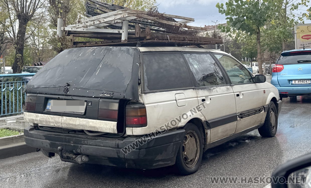 Кола на „видима възраст“ над 35 години и с ужасяваща визия бе забелязана из трафика на Хасково днес по обяд. Комбито „Фолксваген Пасат“ е произведено преди 1988 година (тогава моделът е спрян) и е с прогнили калници, ламарини вместо стъкла и липсващи дръжки по вратите.