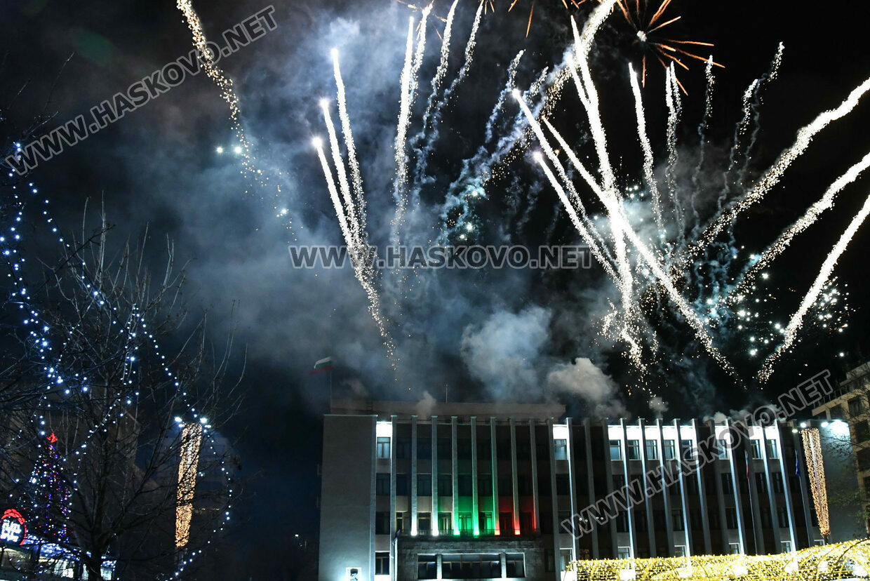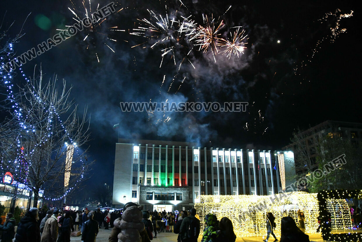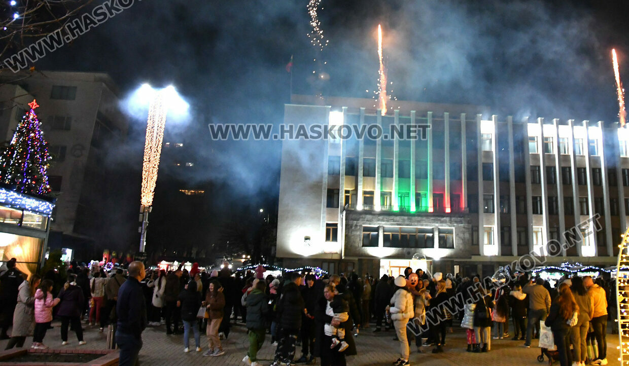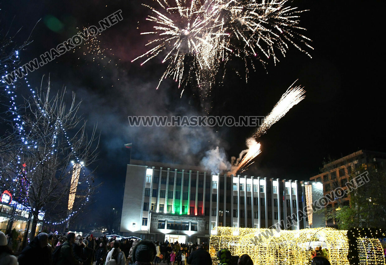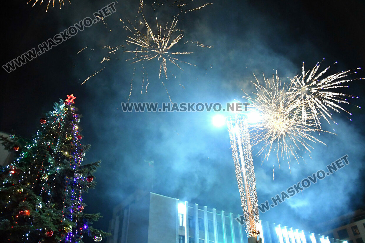 По-късно последва обратно броене до запалването на светлините на елхата, което бе придружено с пищна заря.