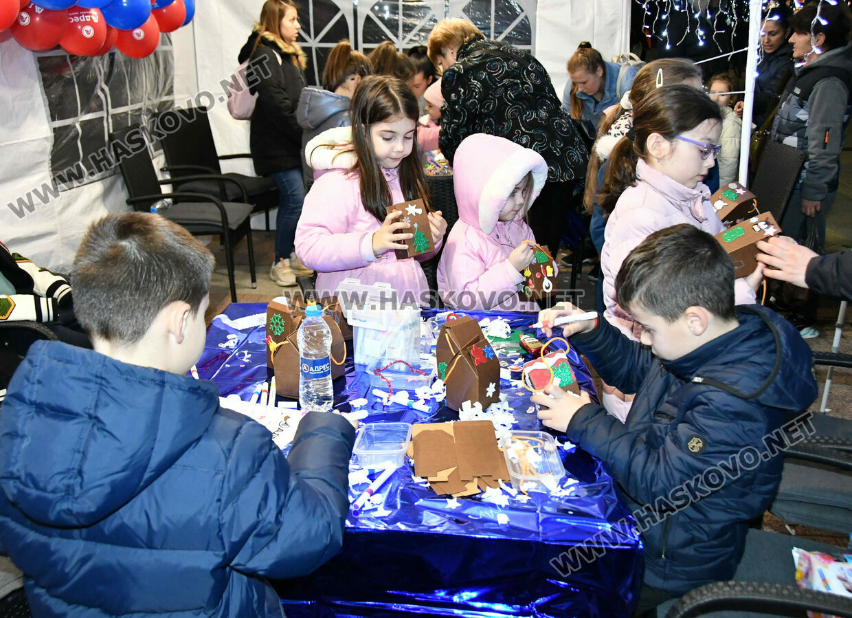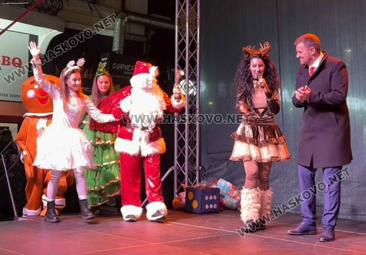 Дядо Коледа пристигна днес на площад „Свобода“ в Хасково и зарадва множество деца и възрастни, дошли за тържественото запалване на светлините на Коледната елха.
