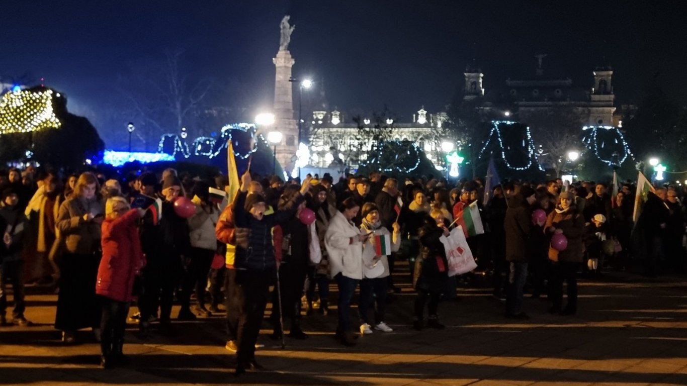 Присъстващите на протеста носят български знамена, а на площада звучат патриотични песни.