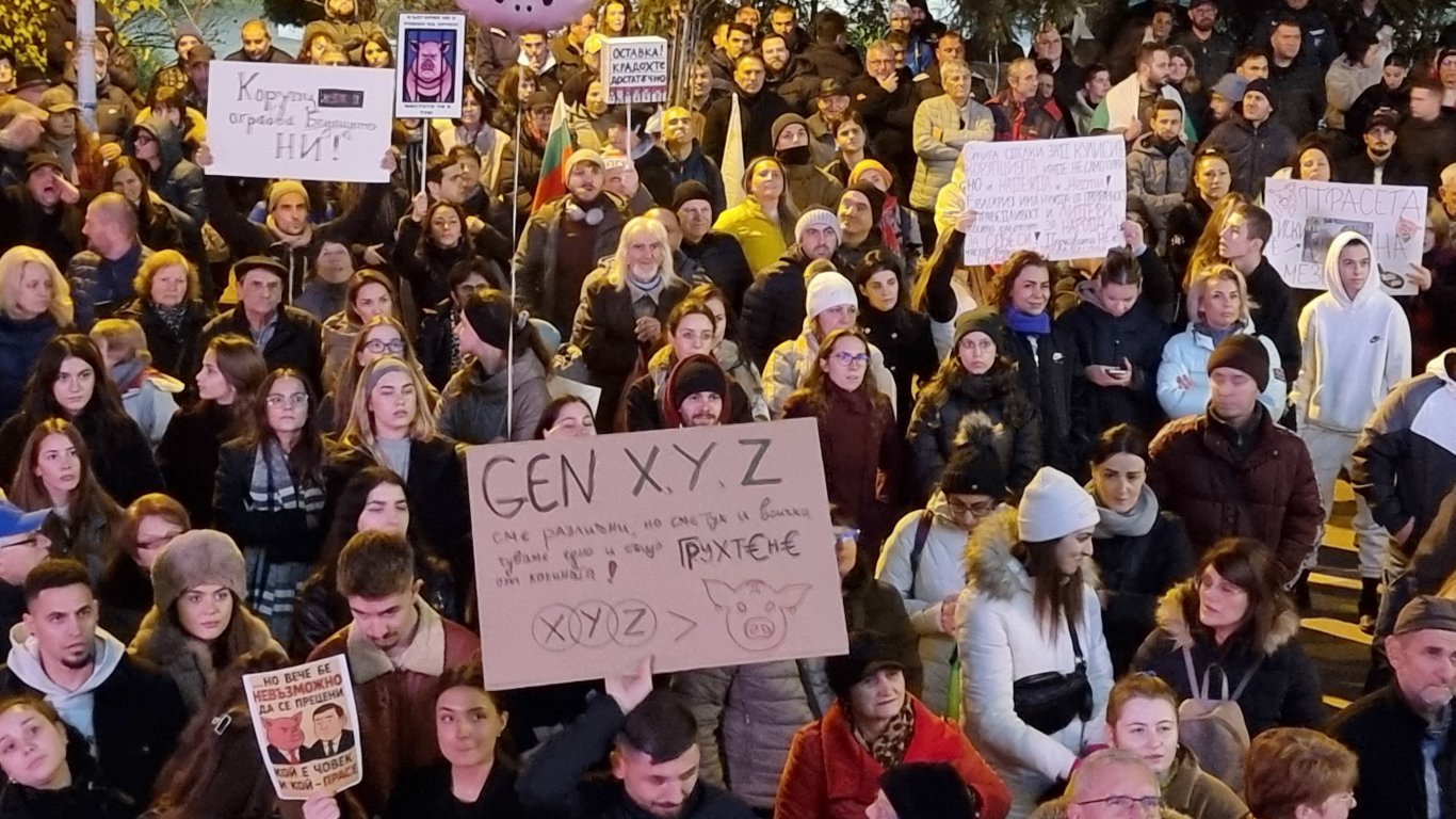 На площада протестиращите скандират "Оставка!", "Мафията вън!" и носат плакати, на които пише: "Оставка", "Ново начало-нов край", "Не сме кочина! Искаме държава!", "Gen Z - не гледат отстрани" и "Държавата не е частна собственост".