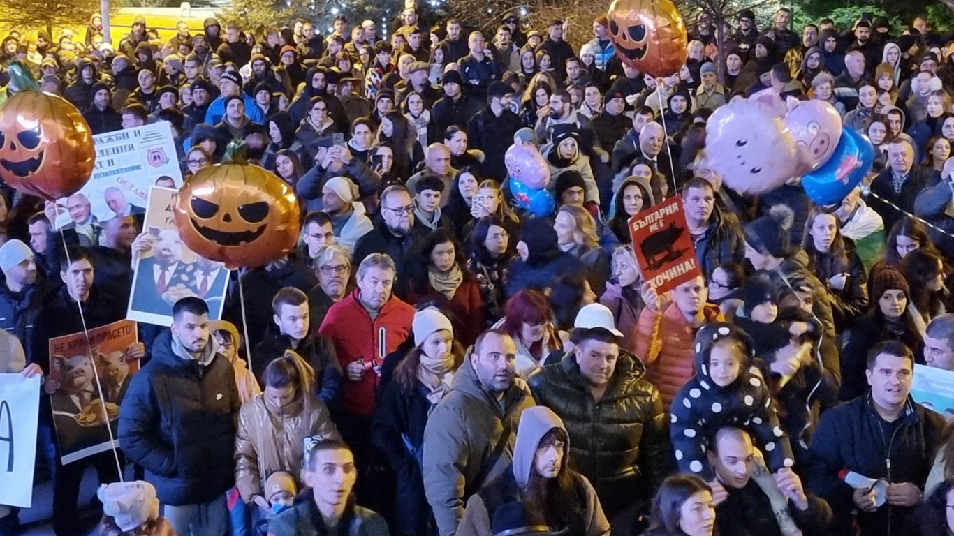 Гражданите изпълниха пространството в пешеходната зона и носят плакати "Искаме прасета на райета", "Не храни прасето с твоите пари", "Оставка" и др.