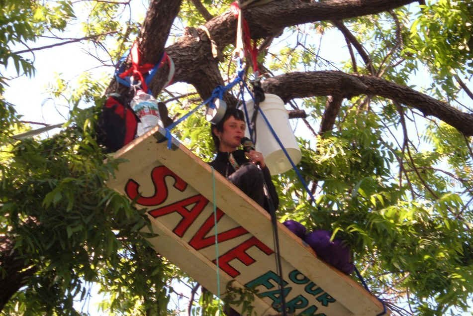Изгражда си обител в клоните на дървото на 10 декември 1997 г. и живее там до декември 1999 г., прекратявайки революционното си действие едва когато е постигнато споразумение с компаниятa да пощадят дървото и да създадат 60-метрова буферна зона около него.