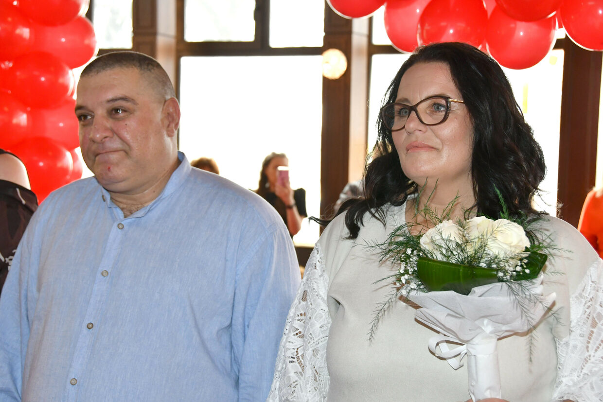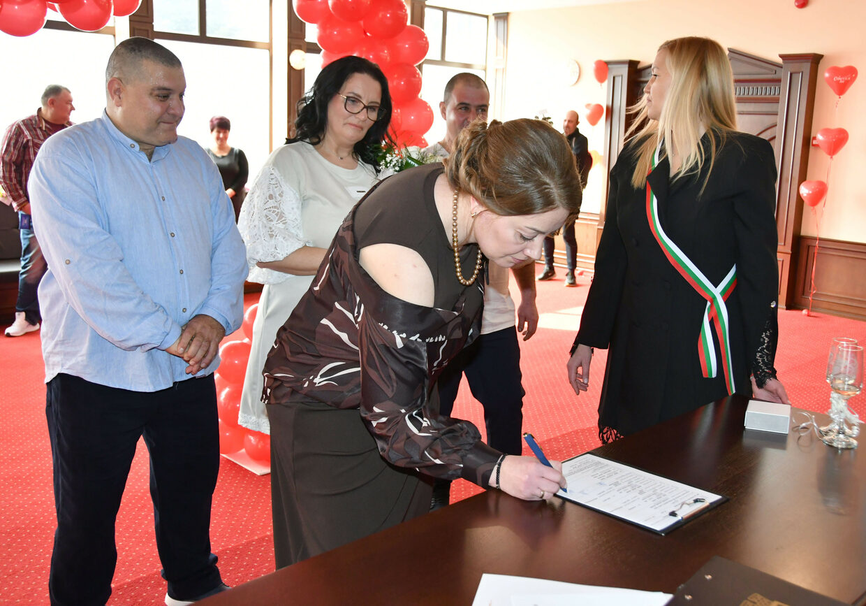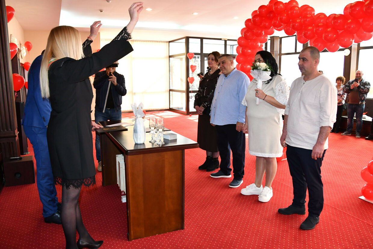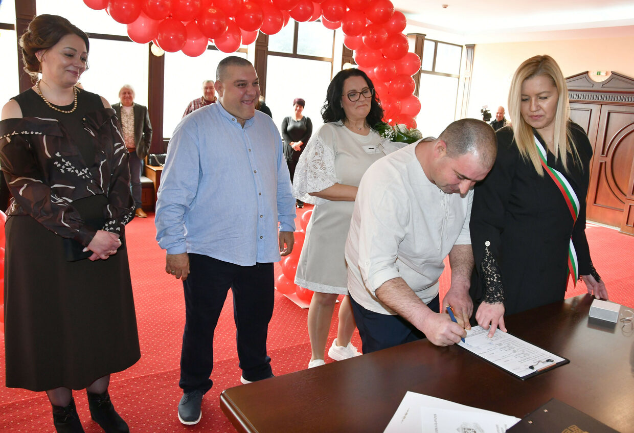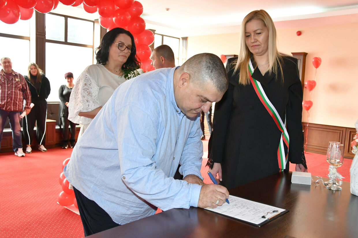 45-годишната Мария Карева и 48-годишният Павел Колев са една от двойките, които днес се врекоха във вярност и скрепиха обетите си с подпис. Двамата живеят на семейни начала от 26 години. Преди два месеца тя му предлага да подпишат граждански брак на 14 февруари.