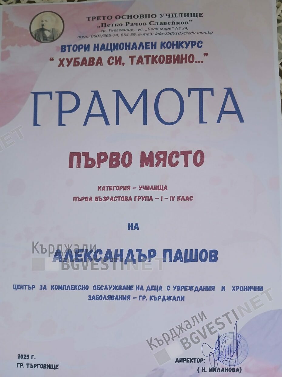 Втори Национален конкурс “Хубава си татковино “град Търговище в категория училища – първа възрастова група отличи с първа награда детето Александър Бориславов Пашов-8години ЦКОДУХЗ – град Кърджали.