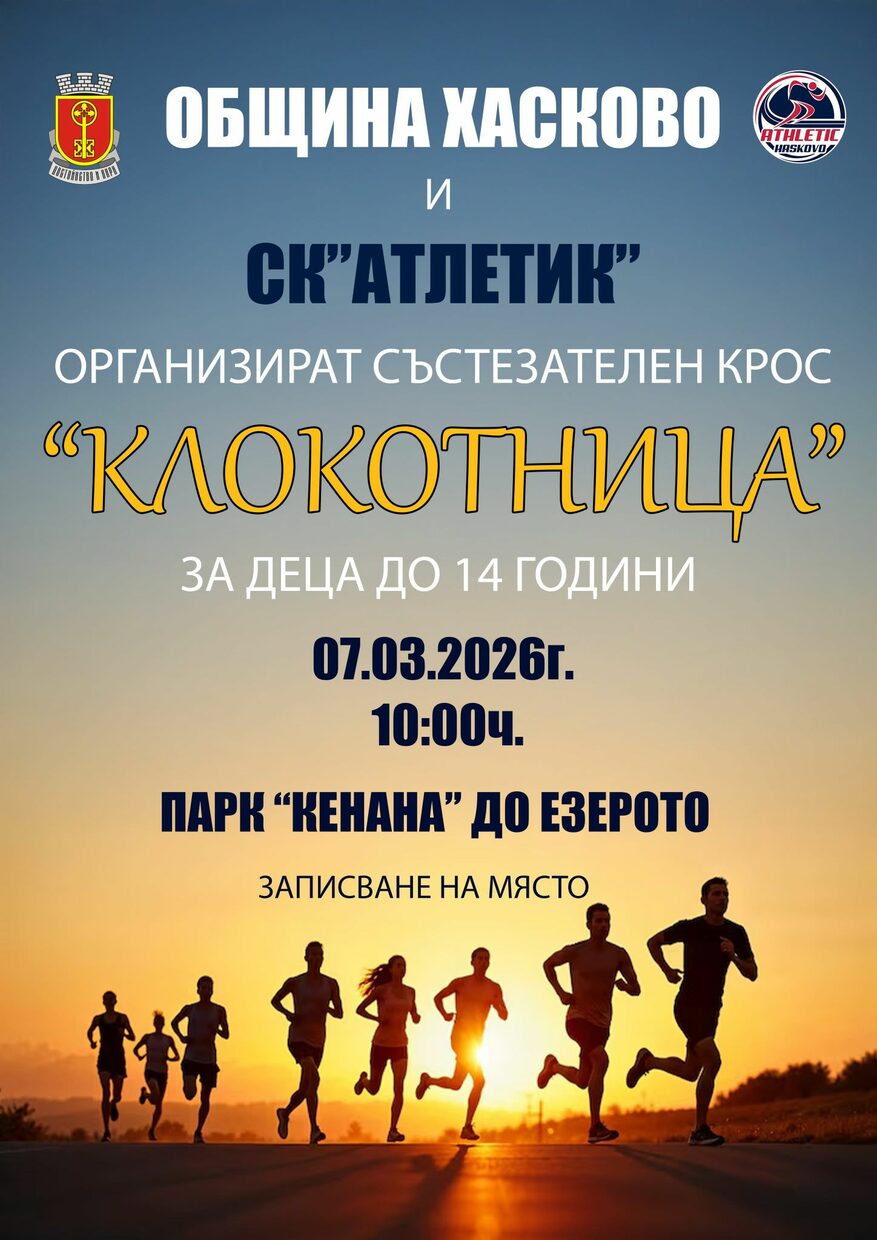 Лекоатлетически крос „Клокотница“ за деца от 6 до 14 г. ще стартира от 10:00 ч. на 07.02.2026 година в парк „Кенана“ (пътя към „Зоопарк“ – Хасково). Записване за участие в кроса за различните възрастови групи ще е на място от 9:30 ч.