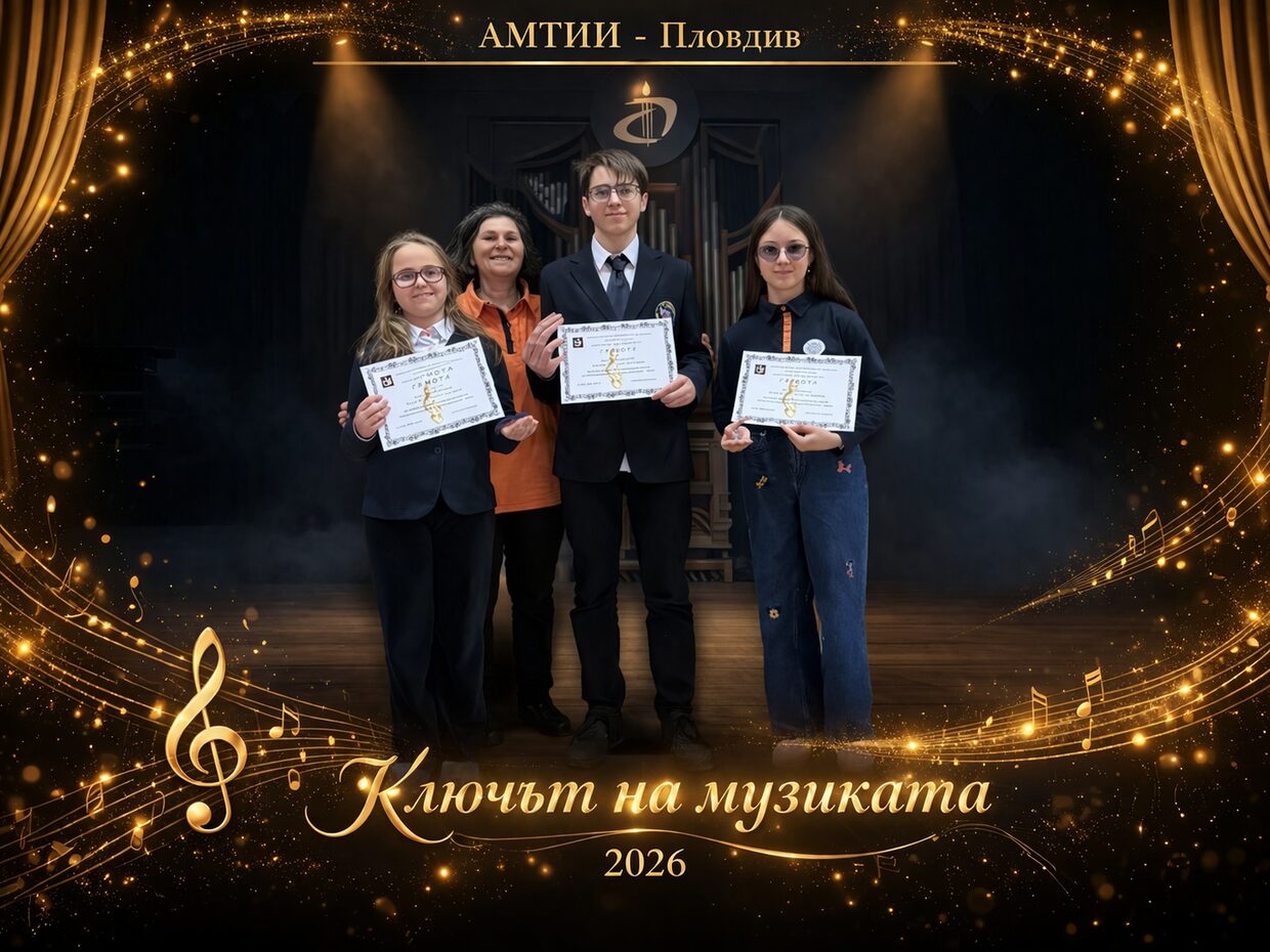 С гордост споделяме блестящото представяне на нашите ученици на Националния финален етап на състезанието „Ключът на музиката“, проведен на 21.03.2026 г. в Академия за музикално, танцово и изобразително изкуство "Проф. Асен Диамандиев" - град Пловдив.