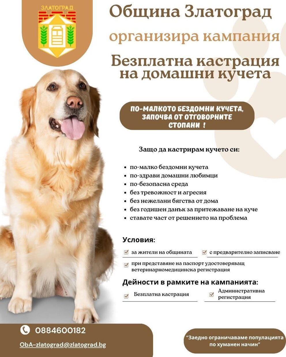 Община Златоград обяви началото на кампания за безплатна кастрация на домашни кучета, насочена към насърчаване на отговорното отглеждане на домашни любимци и ограничаване на популацията на бездомни животни. Инициативата е част от усилията на местната администрация за създаване на по-безопасна и здравословна среда както за гражданите, така и за техните четириноги спътници. От общината подчертават, че намаляването на броя на бездомните кучета започва именно от отговорното поведение на стопаните. Сред основните ползи от кастрацията са подобряване на здравословното състояние на животните, намаляване на агресивното поведение и тревожността, както и ограничаване на нежеланите бягства. Освен това, кастрираните кучета не подлежат на годишен данък, което е допълнително облекчение за стопаните. В рамките на кампанията ще се извършва безплатна кастрация на домашни кучета за жители на общината. Желаещите да се възползват от инициативата трябва да направят предварително записване и да представят паспорт на животното, удостоверяващ ветеринарномедицинска регистрация. От Община Златоград призовават гражданите да се включат активно в кампанията и да станат част от решението на проблема с бездомните кучета.