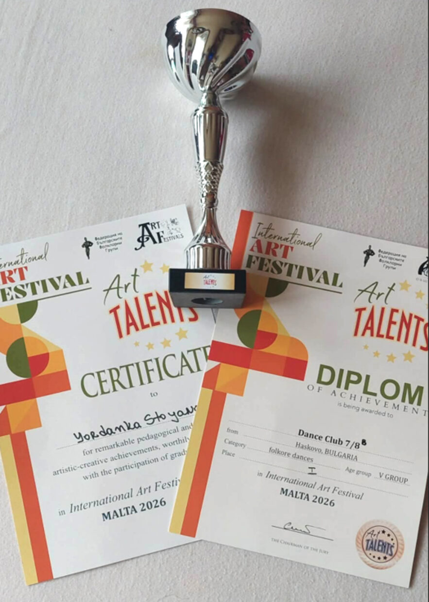 Танцов клуб „7/8б Хасково“ завоюва престижното първо място в раздел „Фолклорни танци“ на Международния арт фестивал „Звездите на Малта“, който се проведе на 31 март в град Мелиха, Малта.