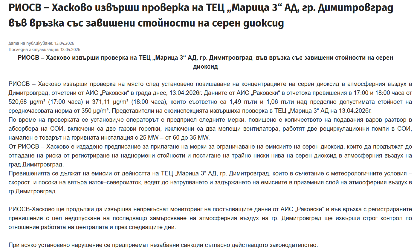 На 13 април – Велики понеделник – жителите на Димитровград са били изложени на повишени и в късните часове вредни нива на серен диоксид във въздуха. Това показват данните от автоматичната измервателна станция „Раковски“ към Изпълнителна агенция по околна среда разположена в центъра на града.